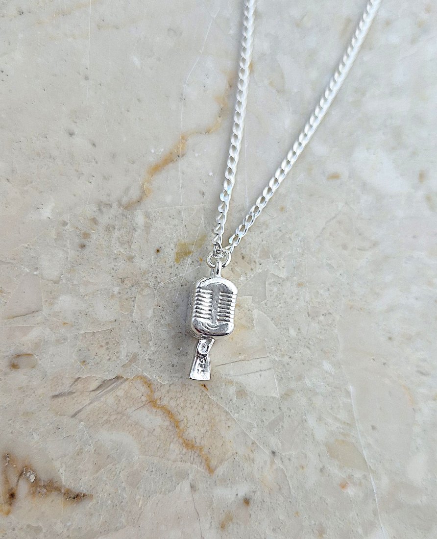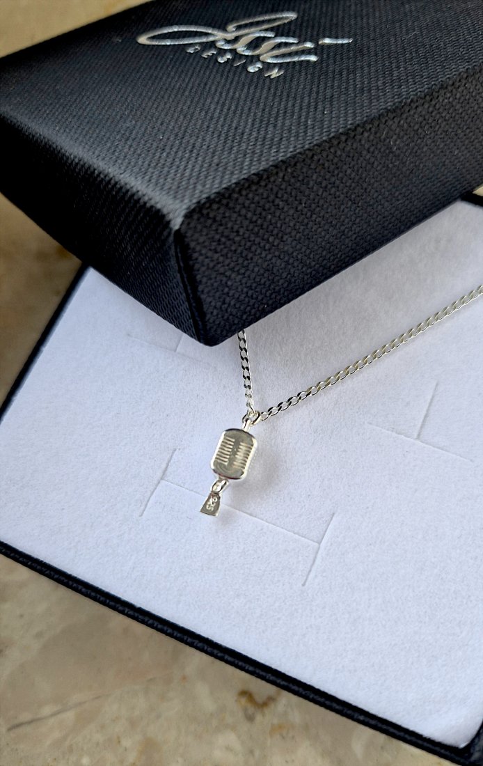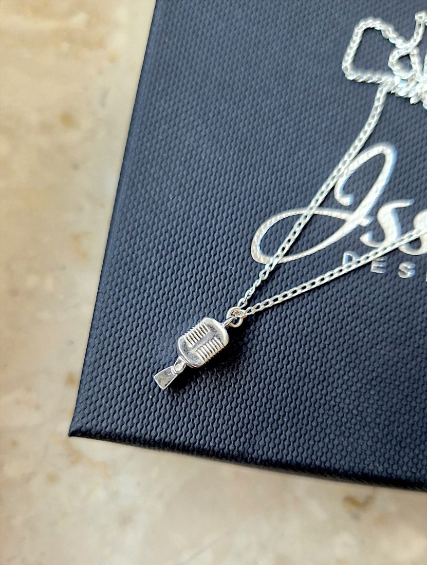 Naszyjnik męski z zawieszką w kształcie mikrofonu. Wykonany ze srebra pr.925.