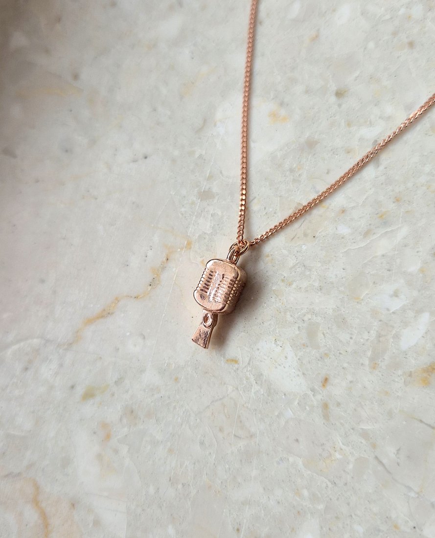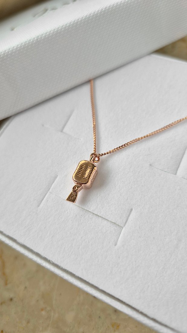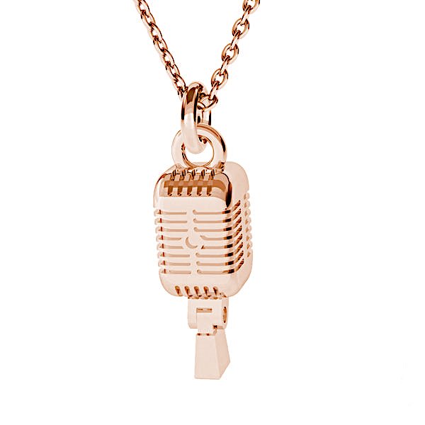 Naszyjnik z zawieszką w kształcie mikrofonu. Wykonany ze srebra pr.925 pokrytego 18K różowym złotem.