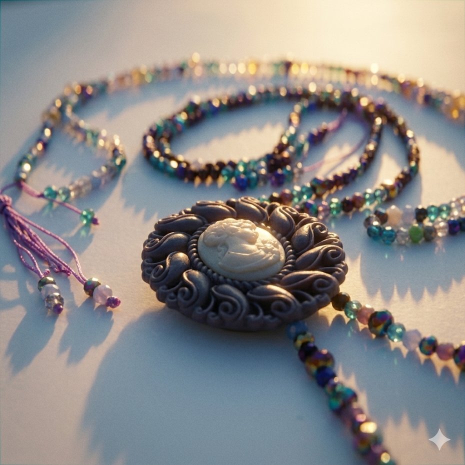 Tagi: #akcesoria-dla-kobiet, #długie sznury korali kamea, #kolorowa-bizuteria-unikat, #naszyjnik kaskadowy retro