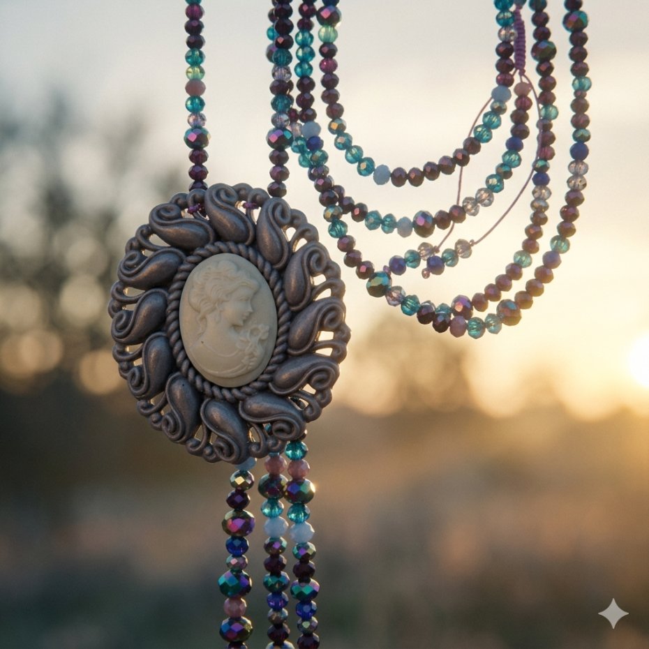 Ten model to definicja biżuterii funkcjonalnej. Dzięki modułowej budowie zyskujesz aż trzy opcje stylizacji: pełny, bogaty zestaw, delikatny łańcuszek z kryształkami lub klasyczny wisior z kameą. Wykorzystanie żywicy i szkła zapewnia trwałość oraz piękny połysk, który nie matowieje z upływem czasu.
