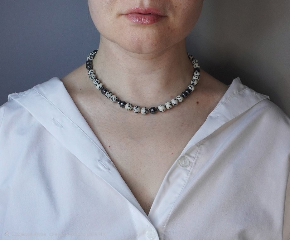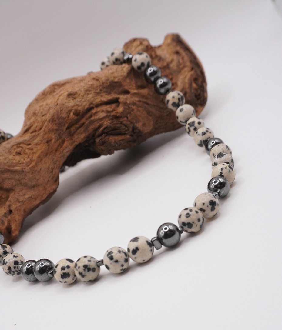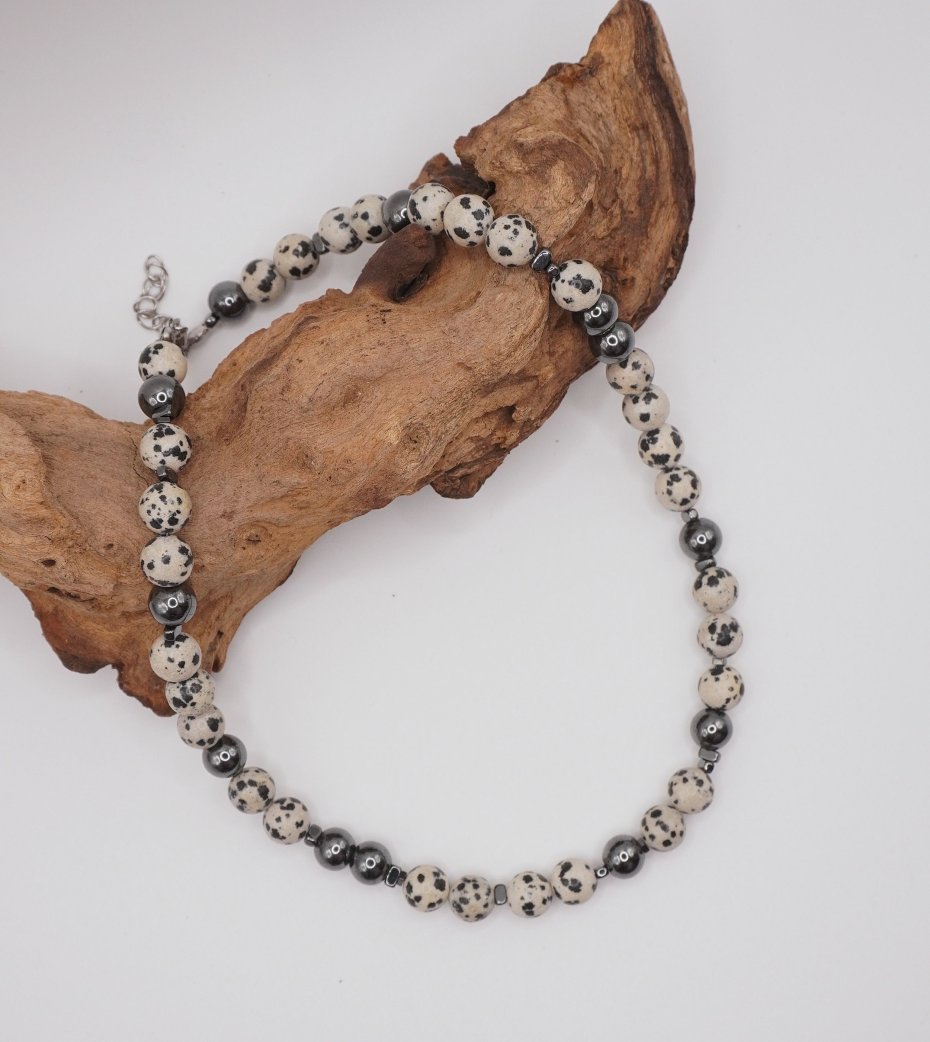Głównym motywem jest jaspis dalmatyńczyk, zachwycający swoimi naturalnymi, czarnymi plamkami na jasnym tle. Kompozycja została przełamana błyszczącymi kulkami ciemnego hematytu, które nadają całości elegancji i biżuteryjnego blasku. To idealny wybór dla osób, które kochają monochromatyczne zestawy i stylizacje oparte na bieli, czerni i szarościach.