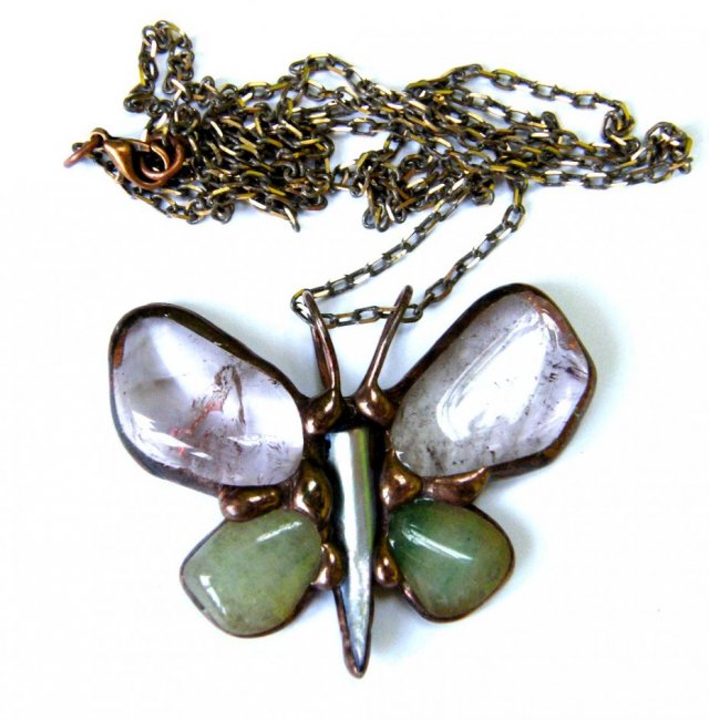 Unikalny wisior wykonany w technice Tiffaniego, z kamieni półszlachetnych: awenturynów i ametystów, oprawionych w cynę.