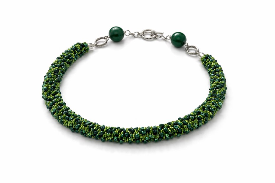 Niezwykle elegancki, ręcznie tkany naszyjnik typu "sznur", wykonany z precyzyjnych czeskich koralików szklanych. Główne sekcje ozdobione są metalowymi, skręconymi elementami, a końcówki wieńczą dwie duże, gładkie kule w odcieniu butelkowej zieleni. Całość dopełnia stylowe zapięcie typu toggle. Długość naszyjnika wynosi 46 cm. Szkło, metal.