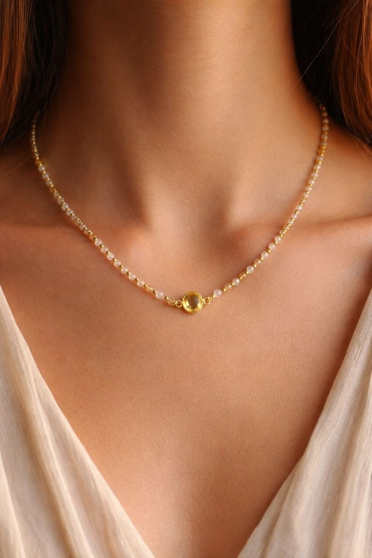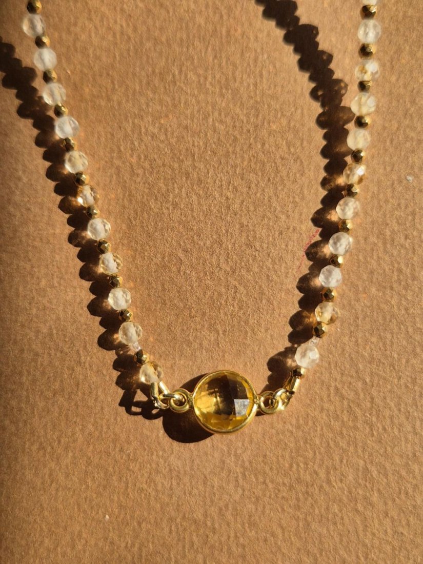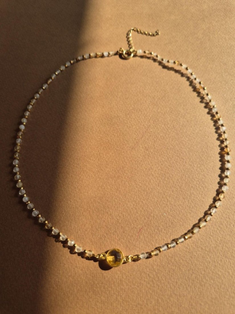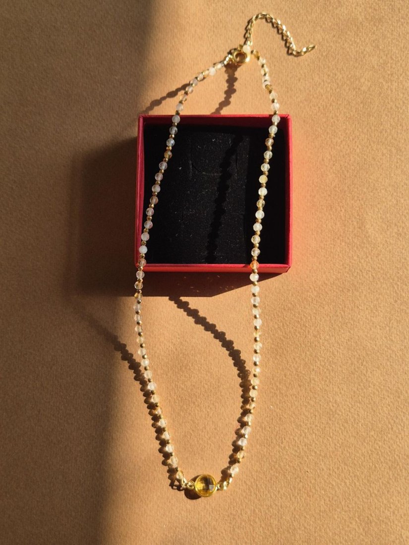 Ten naszyjnik powstał z potrzeby uchwycenia światła – ciepłego, miękkiego, wiosennego. Tworzony ręcznie z naturalnych cytrynów i drobnych hematytów, zachwyca subtelną grą odcieni i delikatnym połyskiem, który pięknie układa się na skórze.