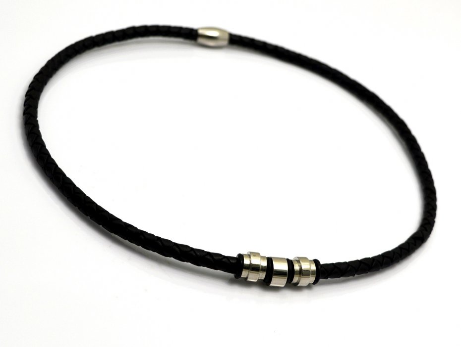 Naszyjnik wykonany z wysokiej jakości plecionego rzemienia skórzanego o średnicy 5mm, w kolorze czarnym oraz elementów ozdobnych ze stali nierdzewnej i kauczuku. Naszyjnik został wykończony zapięciem magnetycznym ze stali nierdzewnej.
