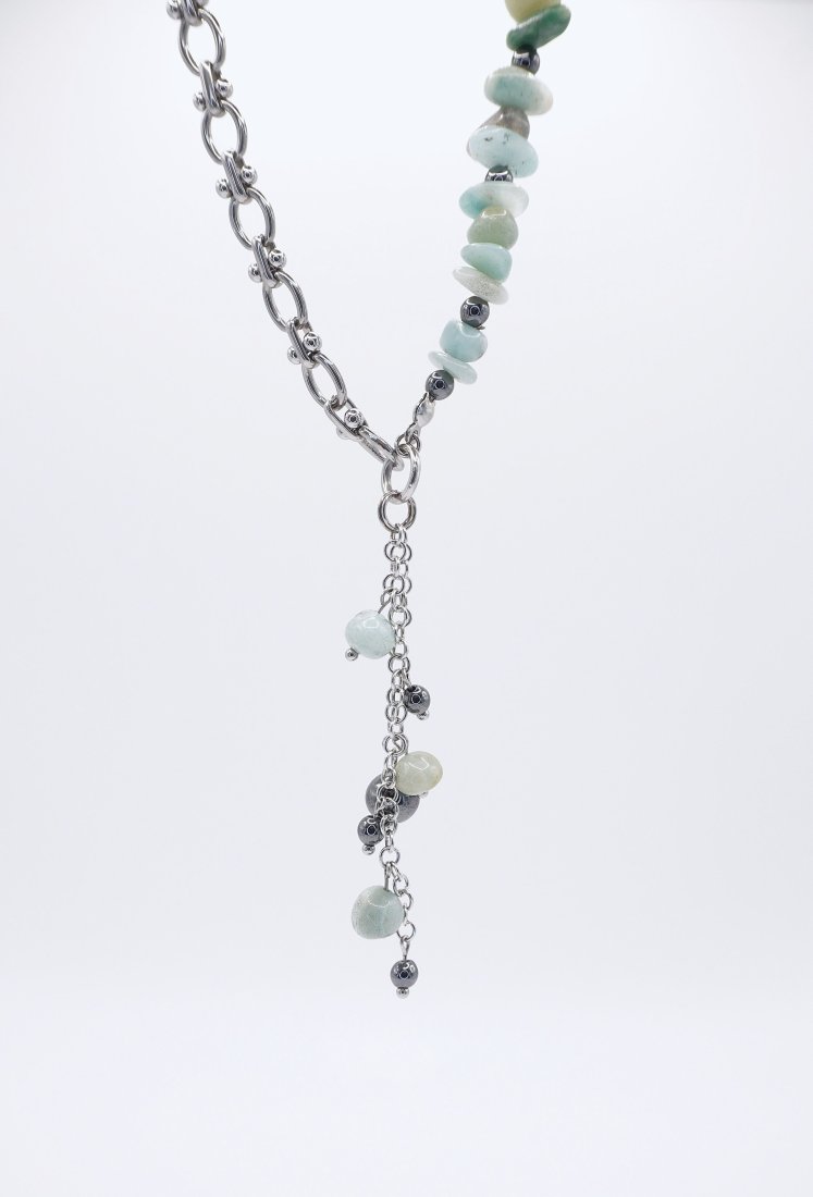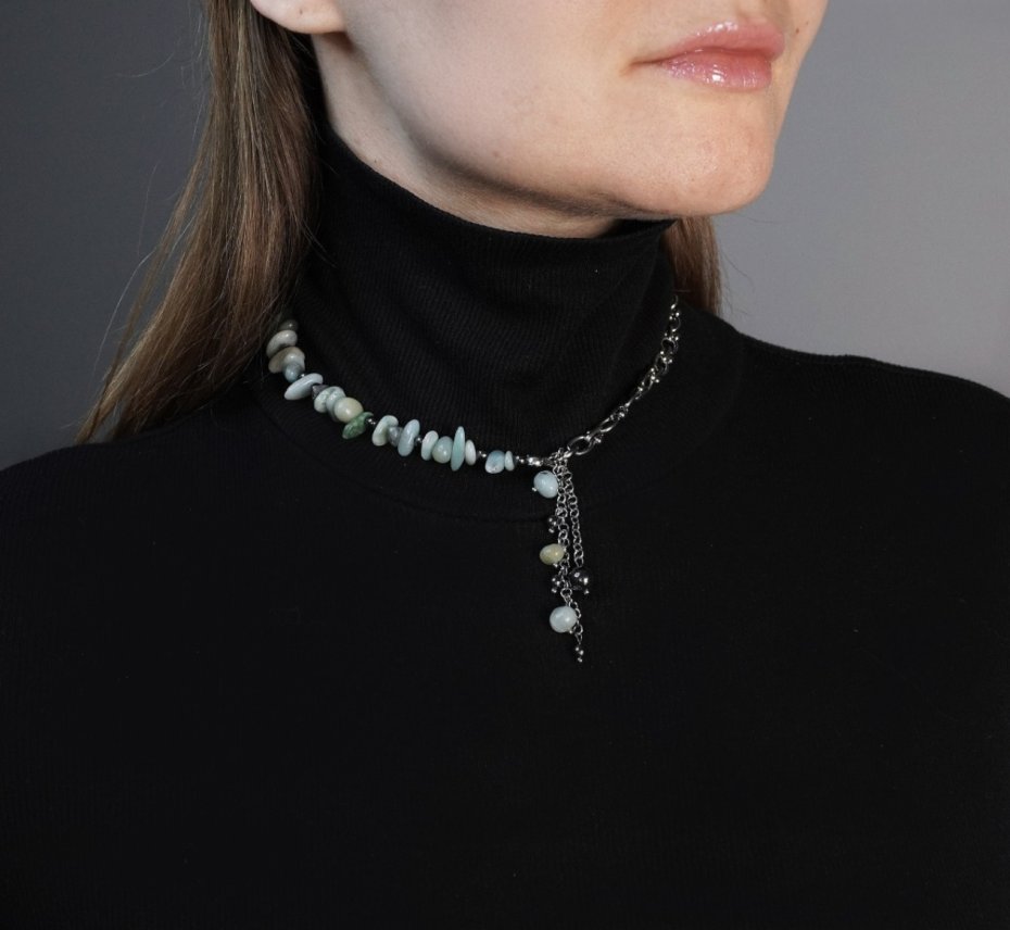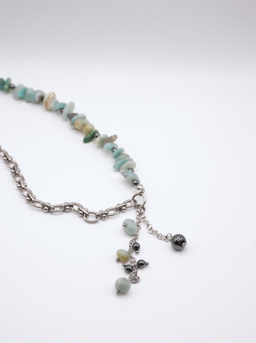 Projekt charakteryzuje się modną asymetrią: jedna strona naszyjnika to sznur naturalnych bryłek amazonitu, druga zaś to minimalistyczny łańcuch o grubym splocie.