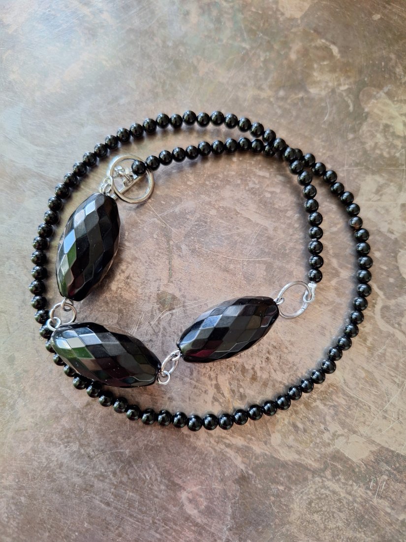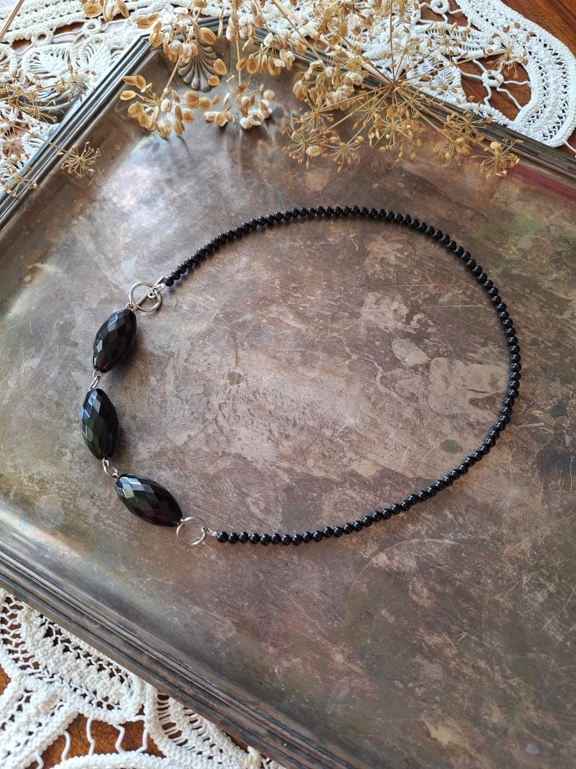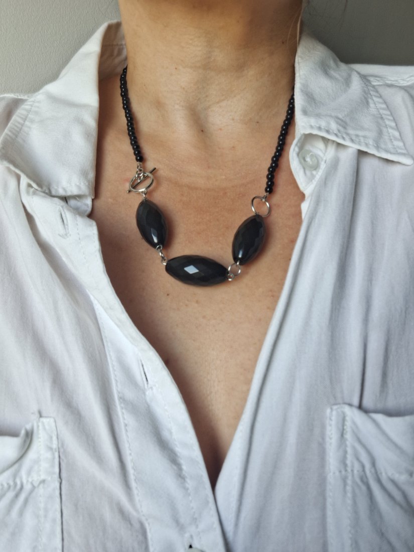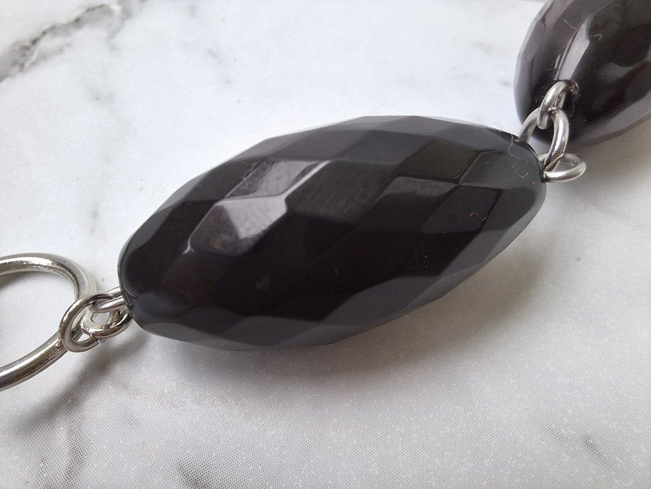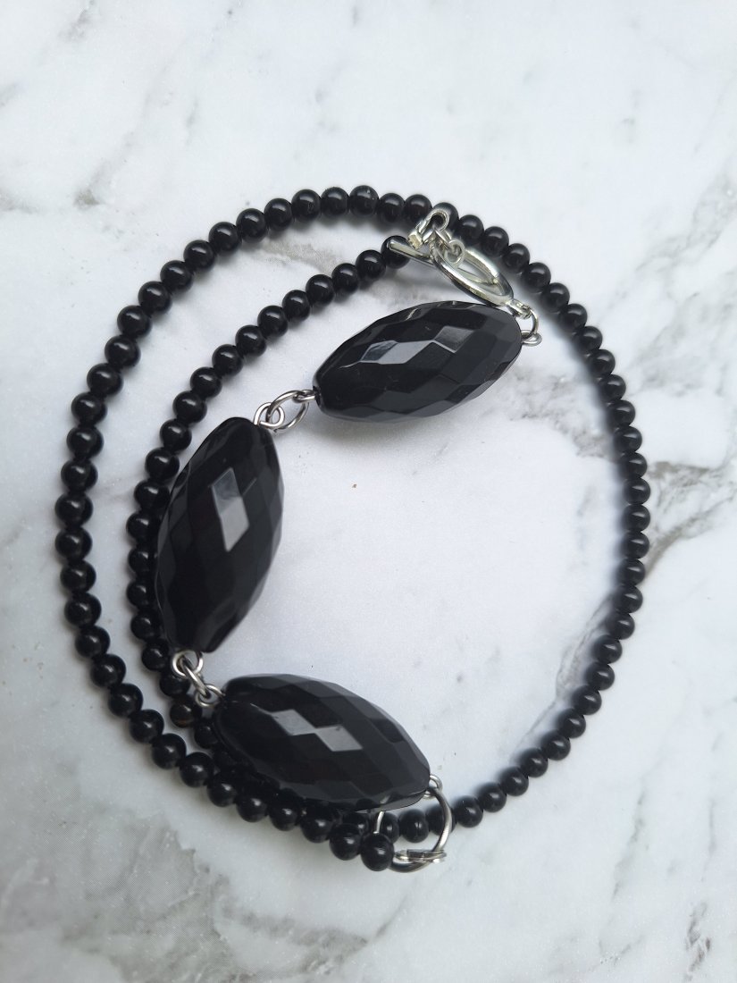 Trzy duże fasetowane onyksy montowane ręcznie na kółkach i pętelkach ze stali chirurgicznej oraz drobne onyksy 4 mm. Zapięcie toggle.