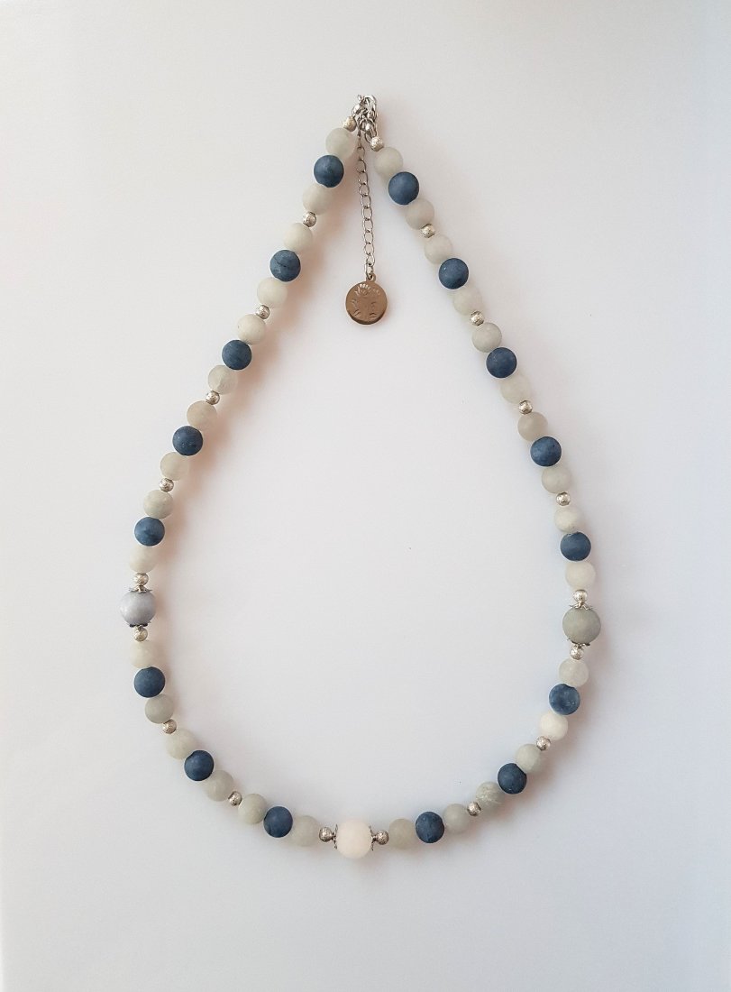 Matowy, bardzo sugestywny jadeit w chłodnych odcieniach, metalizowane srebrne kuleczki i mała zawieszka jak mroźny rysunek na szybie.