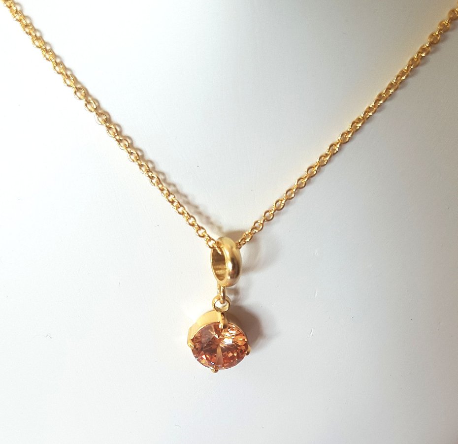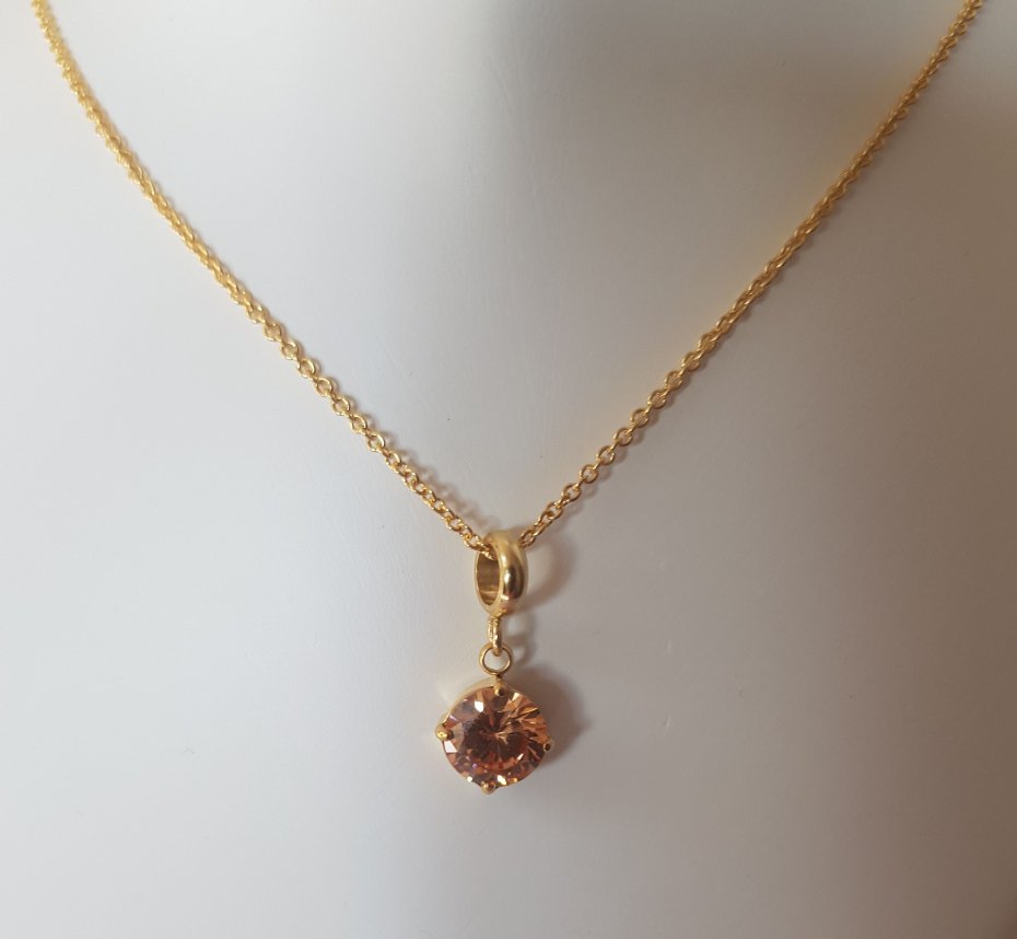 Elegancki, delikatny łańcuszek z brzoskwiniową cyrkonią pięknie współpracującą ze światłem.