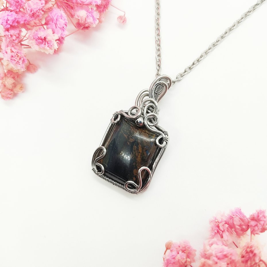 Naszyjnik Pietersyt ręcznie robiony. Wykonany techniką wire wrapping z drutów ze stali chirurgicznej.