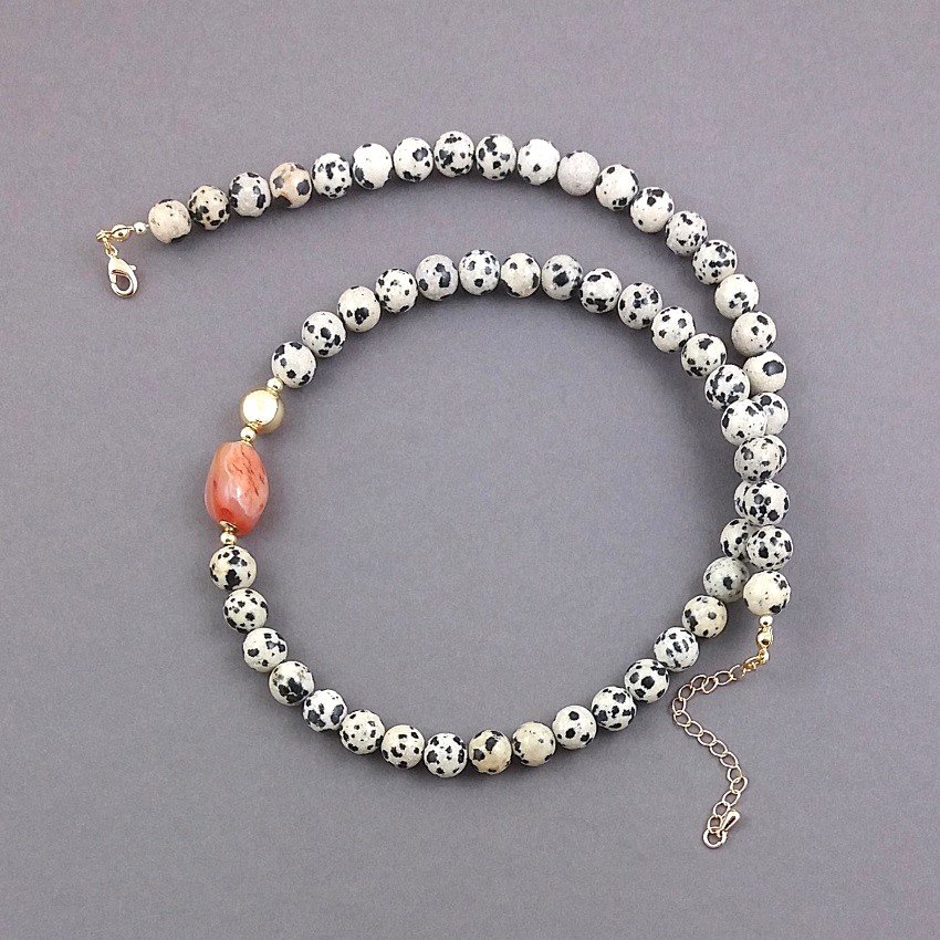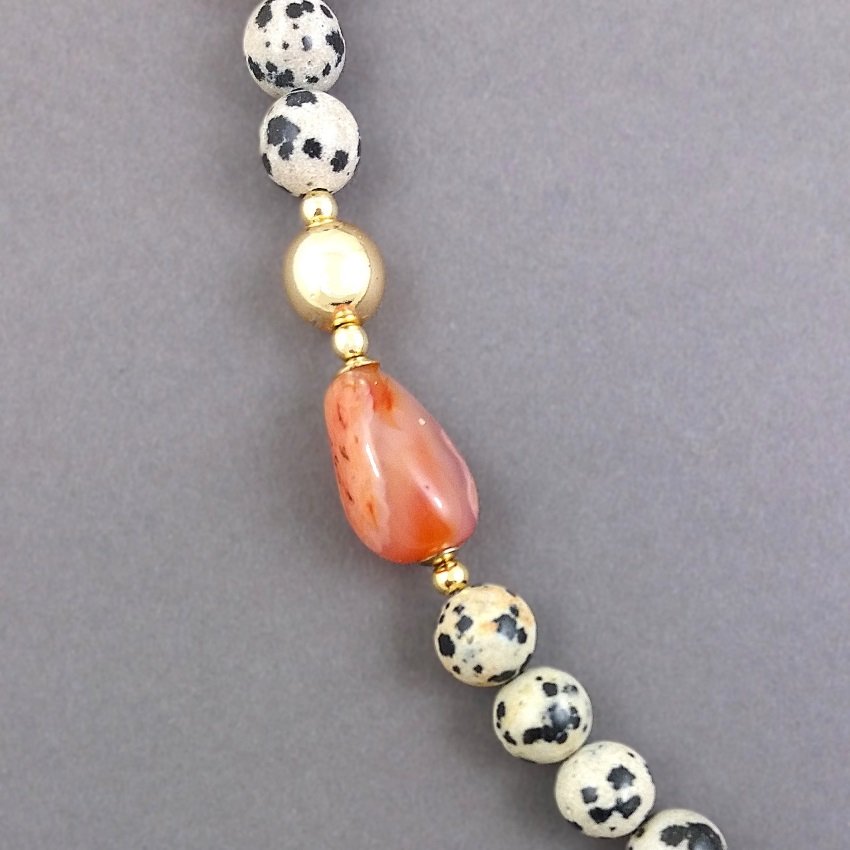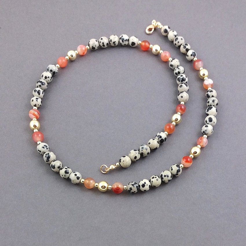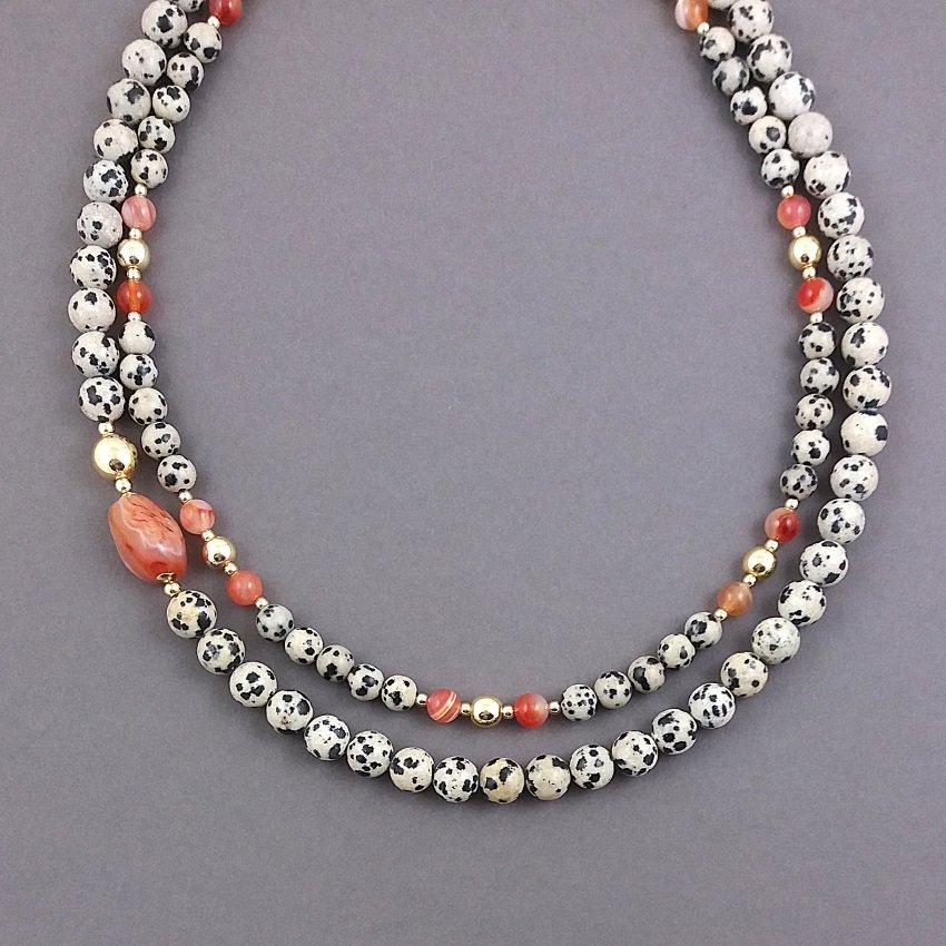 Oryginalny, kaskadowy naszyjnik składający się z dwóch sznurów ( każdy z nich ma osobne zapięcie) naturalnych kamieni półszlachetnych. Pierwszy, z gładkich kul jaspisu dalmatyńskiego, złotej kuli hematytu i nieregularnej bryłki agatu, o pięknej barwie łososiowo pomarańczowej ma długość ok. 52cm plus 5cm przedłużki. Kamienie mają średnicę 8mm.