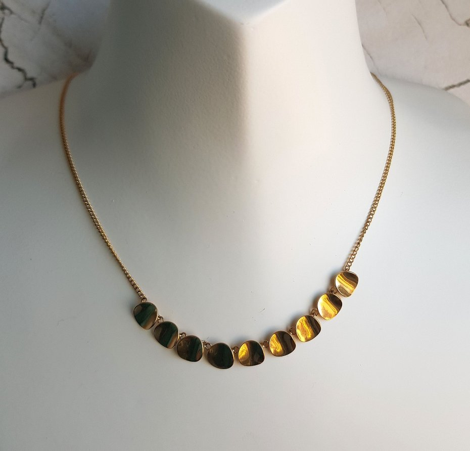 Dziewięć lekko wygiętych, połączonych, ruchomych kółeczek na łańcuszku.