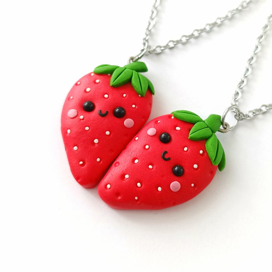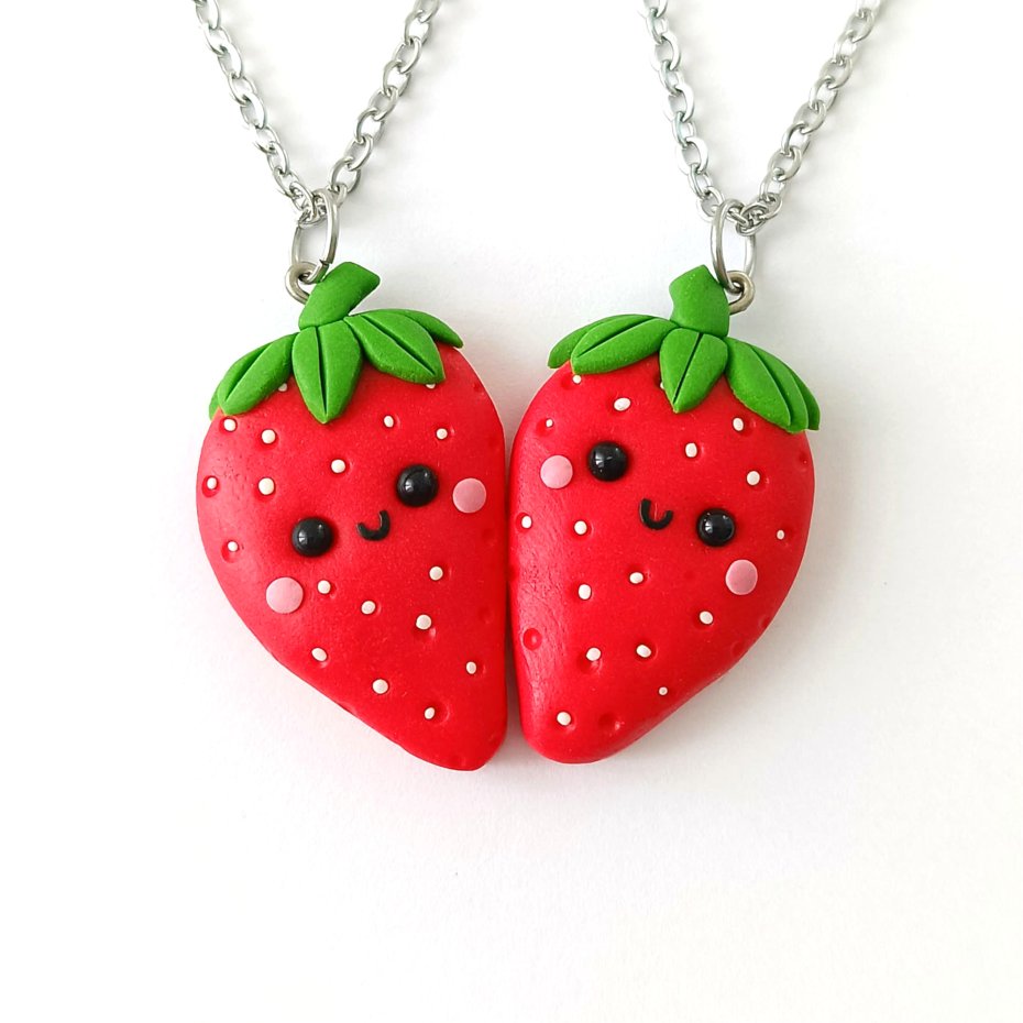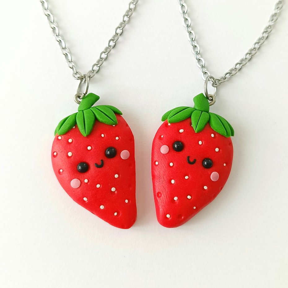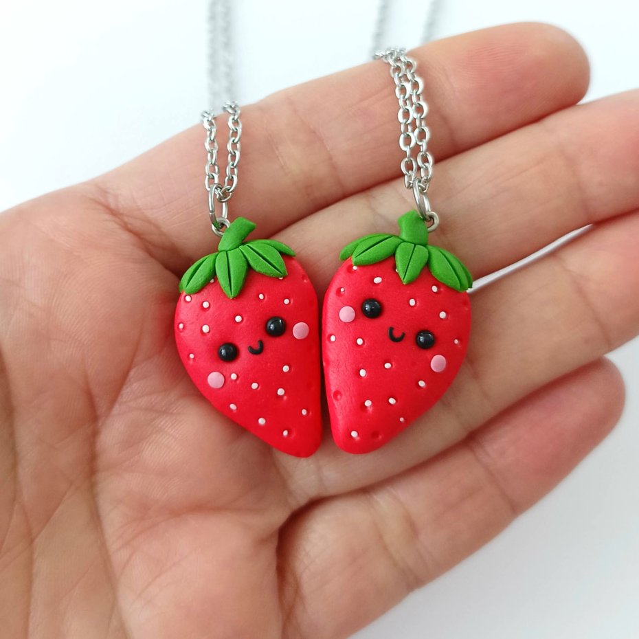 Zestaw składa się z dwóch połówek truskawek, które po połączeniu tworzą jedno serce — idealny symbol przyjaźni, siostrzanej więzi lub wyjątkowej relacji
