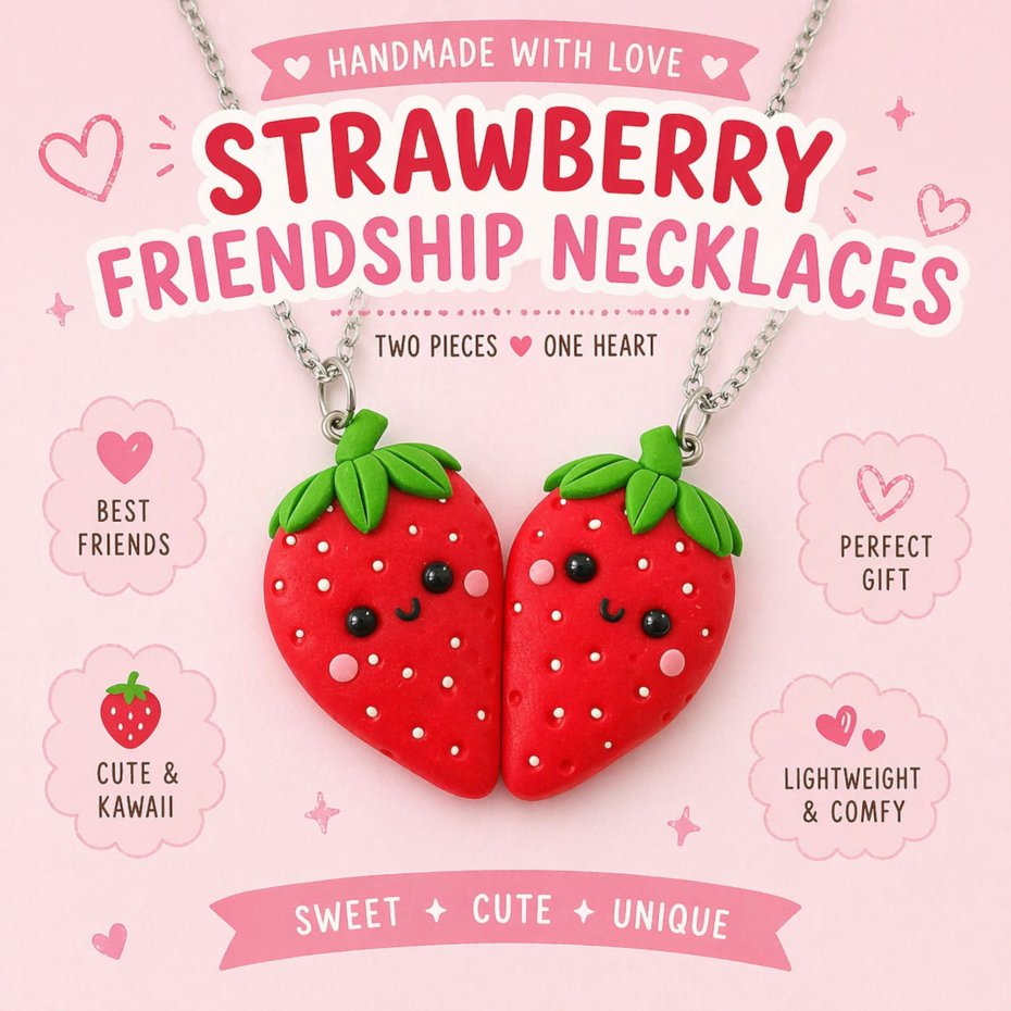 Naszyjnik Przyjaźni Truskawki BFF – Kawaii, Dwie Połówki Serca, Prezent dla Siostry lub Przyjaciółki