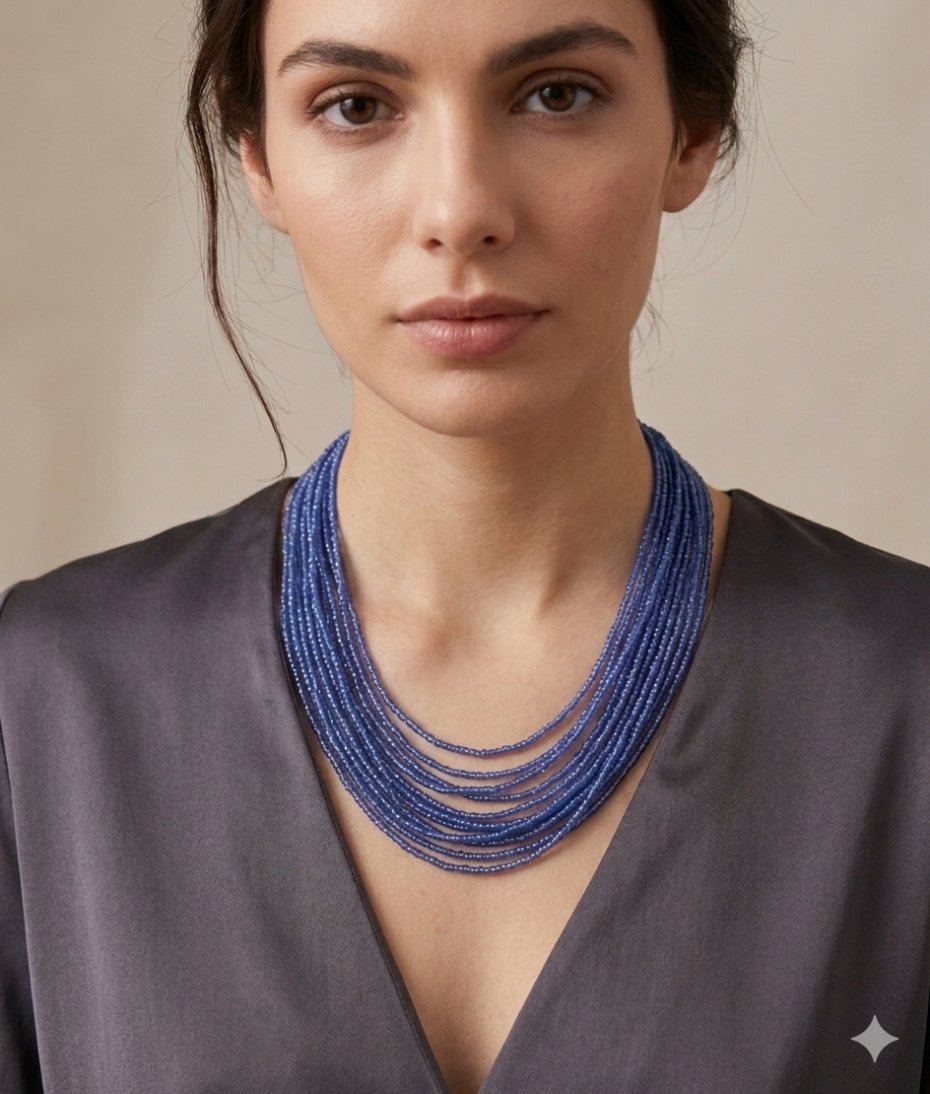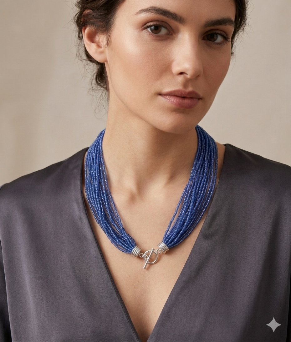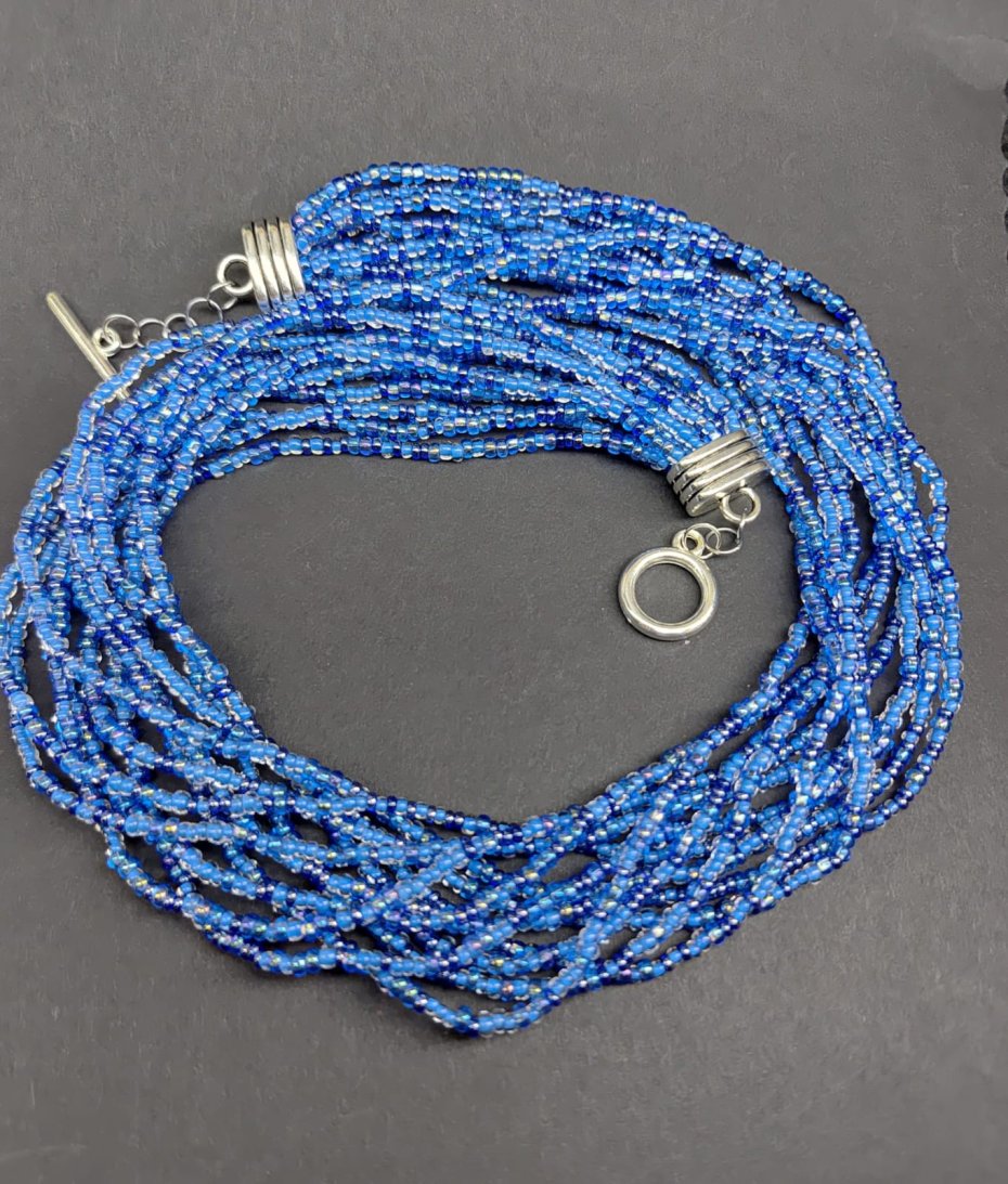 Emanujący spokojem i elegancją, ten wyjątkowy naszyjnik to połączenie rzemieślniczej precyzji z nowoczesnym stylem. Składa się z dziesiątek drobnych, szklanych koralików w różnych odcieniach błękitu i szafiru, które tworzą efektowną, bogatą strukturę.
