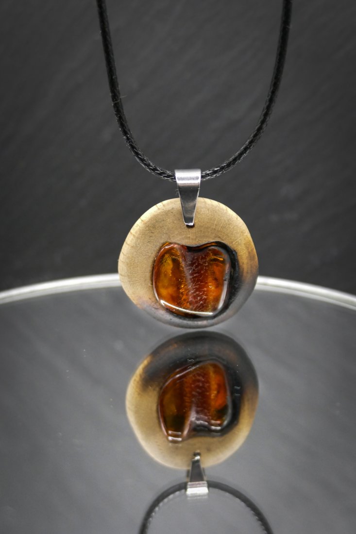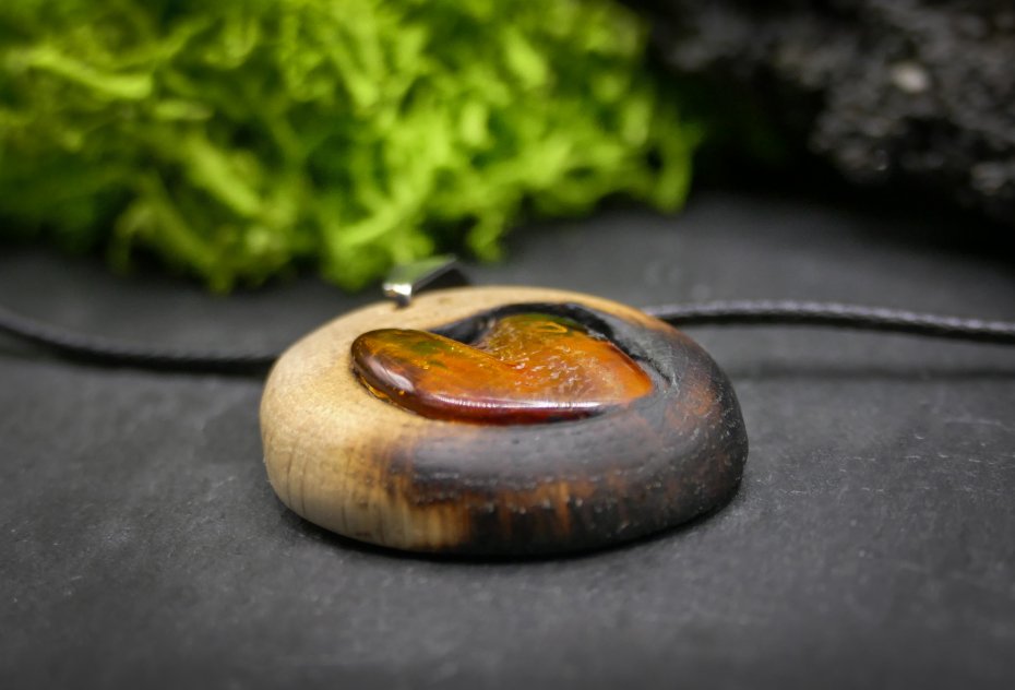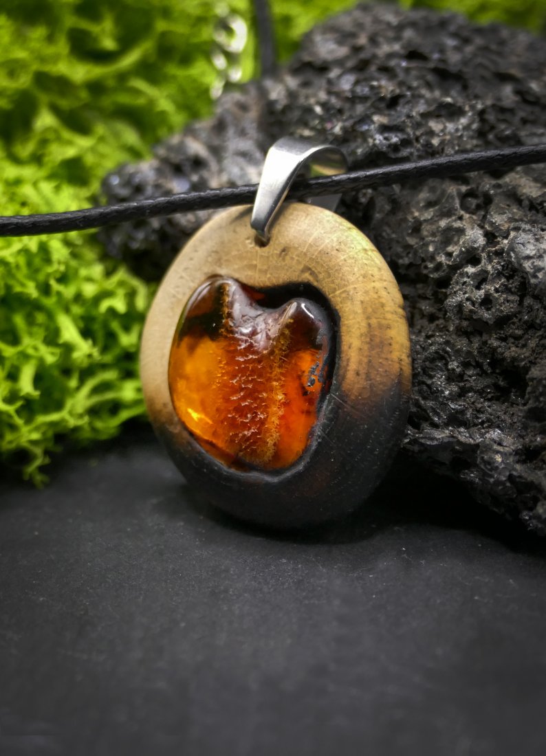 W centrum umieszczono efektowny bursztyn o kształcie serca — subtelny akcent koloru i światła.
