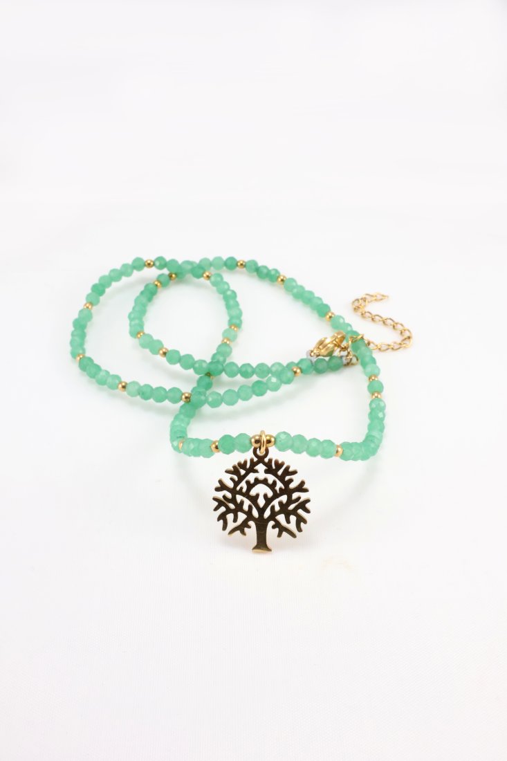 Odkryj harmonię natury i elegancji z tym wyjątkowym naszyjnikiem, który łączy w sobie głębokie znaczenie z subtelnym blaskiem. Naturalny, fasetowany Awenturyn w kolorze zieleni, znany jako kamień szczęścia, spokoju i dobrobytu. Stylowe, ażurowe Drzewo Życia - symbol siły, wzrostu, rodziny i połączenia ze światem. Wykonane ze stali chirurgicznej (nierdzewnej) w kolorze złotym, co zapewnia trwałość i hipoalergiczność. Drobne, złote koraliki ze stali chirurgicznej dodają blasku i rozdzielają zielone kamienie, tworząc elegancki rytm. Idealny dodatek do stylizacji casualowych i boho, ale też jako dyskretny, kolorowy akcent do bardziej formalnego ubioru.
