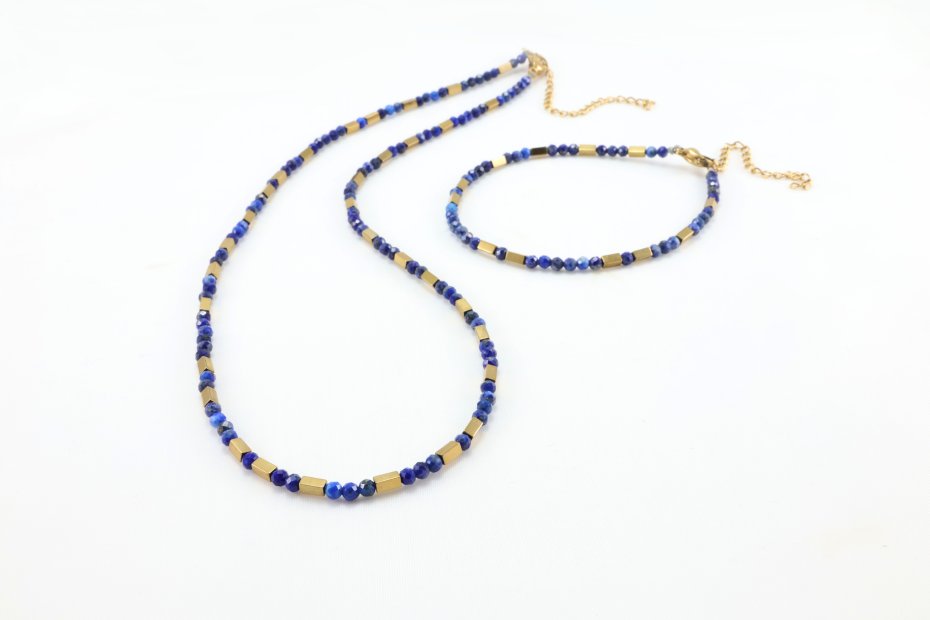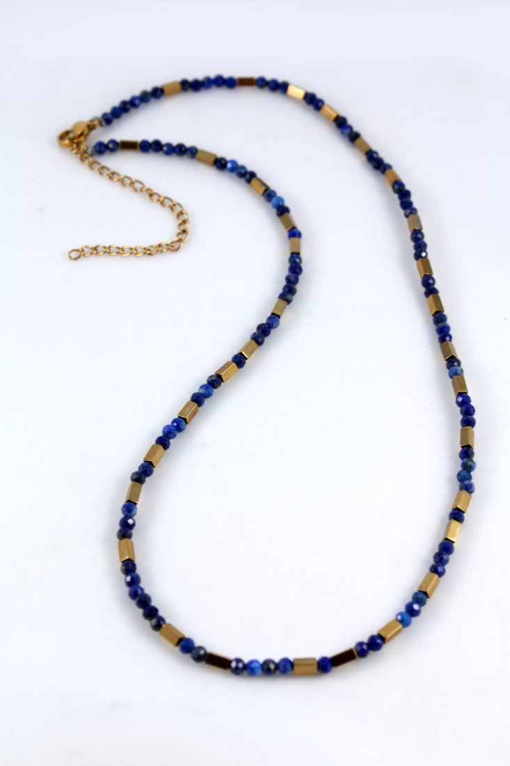 Naszyjnik z naturalnych kamieni lapis lazuli, które mają niezwykłe właściwości: pomagają w jasnej komunikacji i wzmacniają logiczne myślenie, kamień starożytnych faraonów symbol mądrości, prawdy i głębokiej intuicji. Naszyjnik poosiada możliwość przedłużenia dzięki czemu można go indywidualnie dopasować. Złote akcenty prostopadłościenne koraliki z hematytów w kolorze złota przełamują rytm kamieni, nadając naszyjnikowi elegancki, geometryczny charakter.