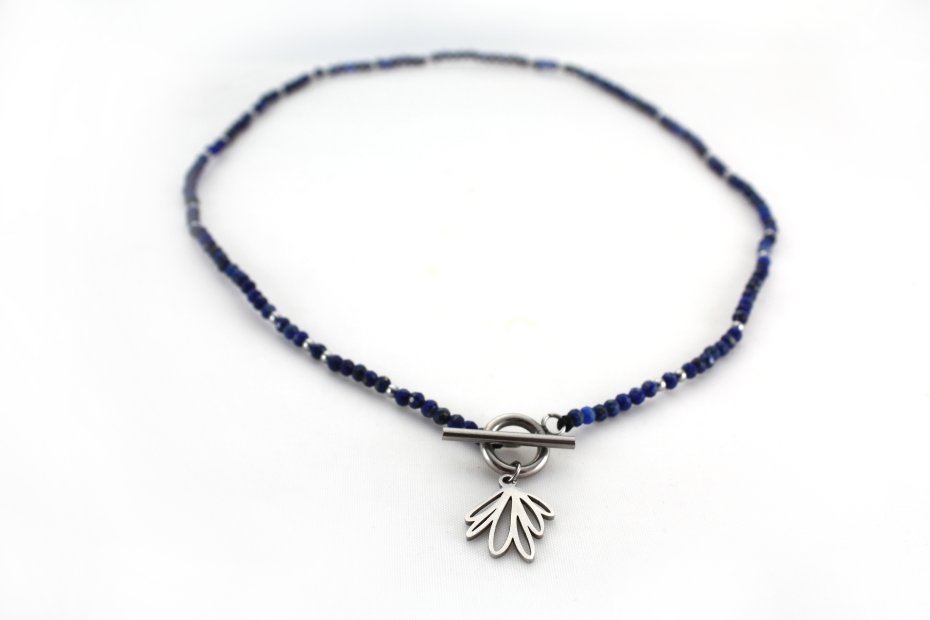 Naszyjnik z wygodnym zapięciem Toggle wykonany z fasetowanego kamienia lapis-lazuri w kolorze głęboko niebieskim z charakterystycznymi dla tego kamienia wtrąceniami z pirytu. Lapis jest symbolem: prawdy, mądrości, spokoju i odwagi. Jest doskonałym dodatkiem do letniej stylizacji.