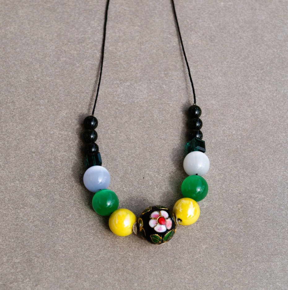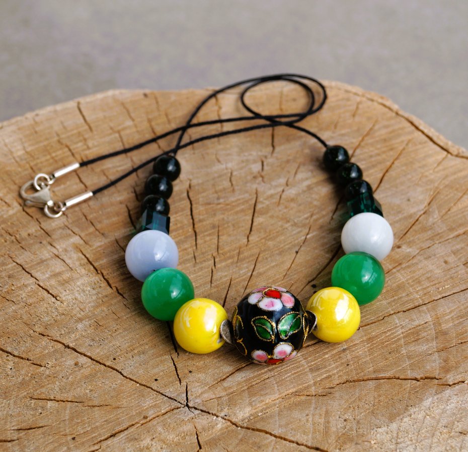 Elegancki naszyjnik wykonany ręcznie z centralną kulą Cloisonné (25 mm), otoczoną ceramicznymi kulami (12 mm), kamieniami kociego oka (12 mm), nocą Kairu (8 mm) oraz kostkami kryształów Swarovski (8 mm). Całość nawleczona na czarnym, trwałym sznurku jubilerskim o grubości 1 mm. Naszyjnik zapinany jest na solidny srebrny karabińczyk próby 925.
