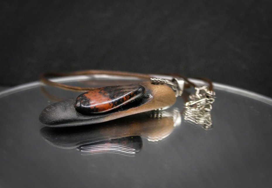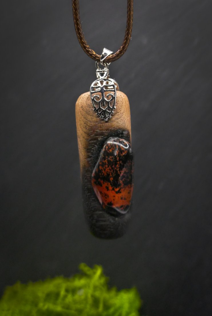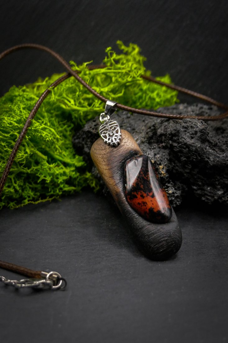 W centrum kompozycji znajduje się obsydian mahoniowy, który pięknie kontrastuje z ciemnym, ciepłym odcieniem drewna.
