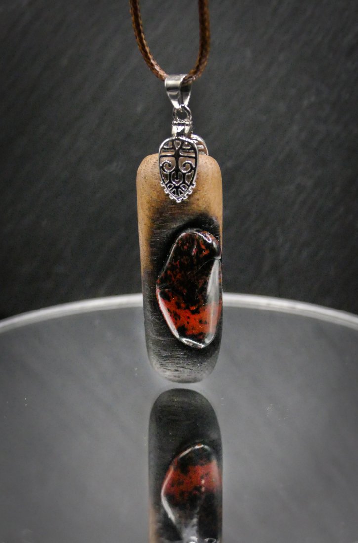 Ręcznie wykonany wisiorek z orzecha amerykańskiego to połączenie naturalnego drewna i kamienia półszlachetnego.