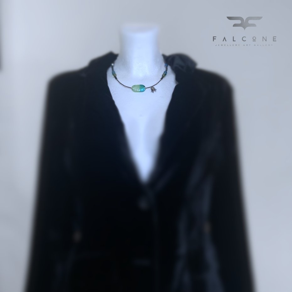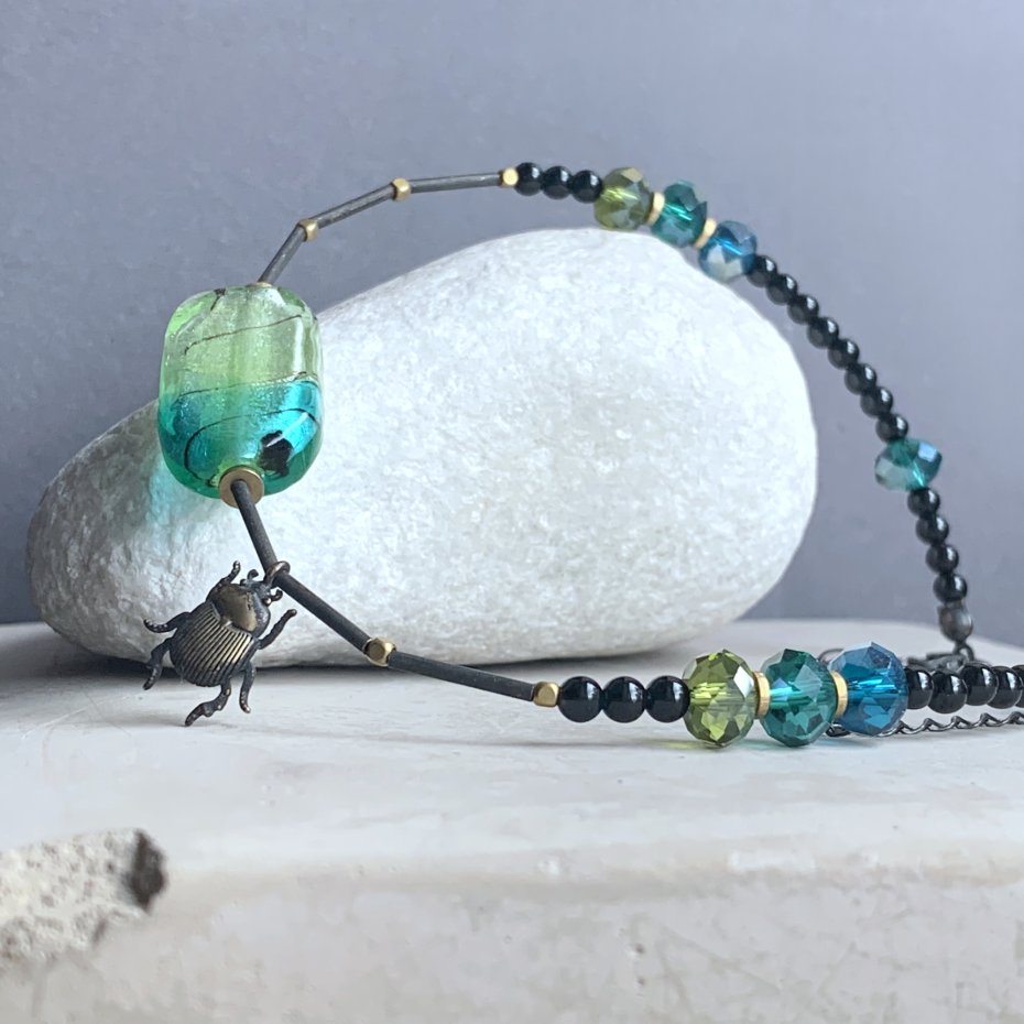 Naszyjnik z kamieni i szkła, w oprawie z mosiądzu i srebra. Naturalne, gładkie kuleczki czarnego onyksu, przeplatają się z kryształowymi oponkami w tonacjach zieleni i błękitu. W centralnym punkcie naszyjnika znajduje się owalna pastylka ze szkła weneckiego w tonacjach turkusowej zieleni i seledynu. Skarabeusz z patynowanego mosiądzu nadaje wyjątkowy charakter całości. Naszyjnik wykończony elementami z mosiądzu i srebra. Zawieszony na delikatnym łańcuszku ze srebra 925. Średnica onyks to ok. 4 mm. Długość pastylki ze szkła weneckiego to 2,5 cm. Długość naszyjnika to ok. 51,5 cm. Długość naszyjnika można regulować poprzez zapięcie na dowolnym ogniwie.