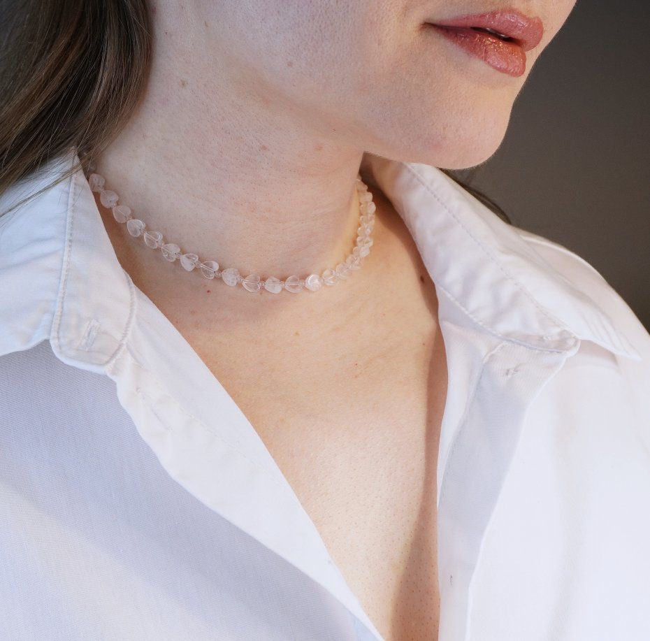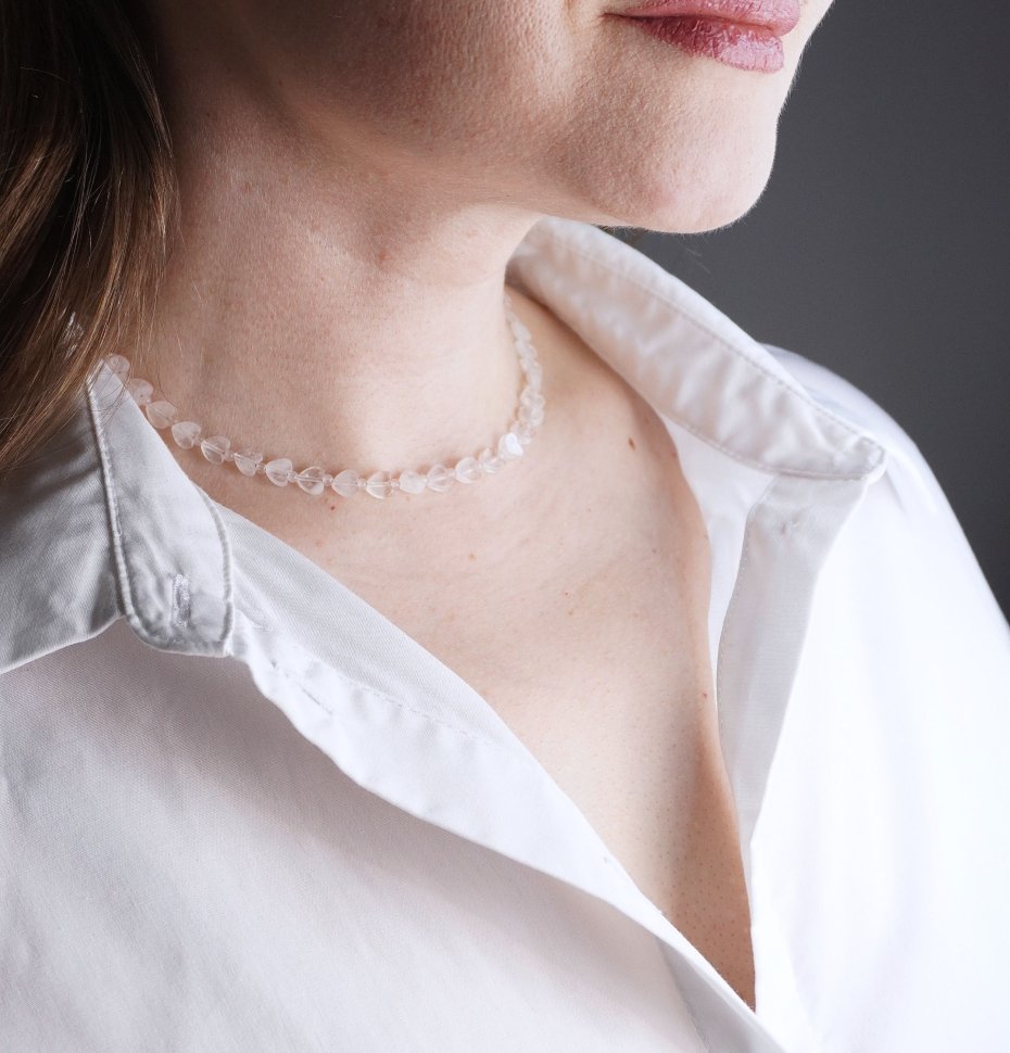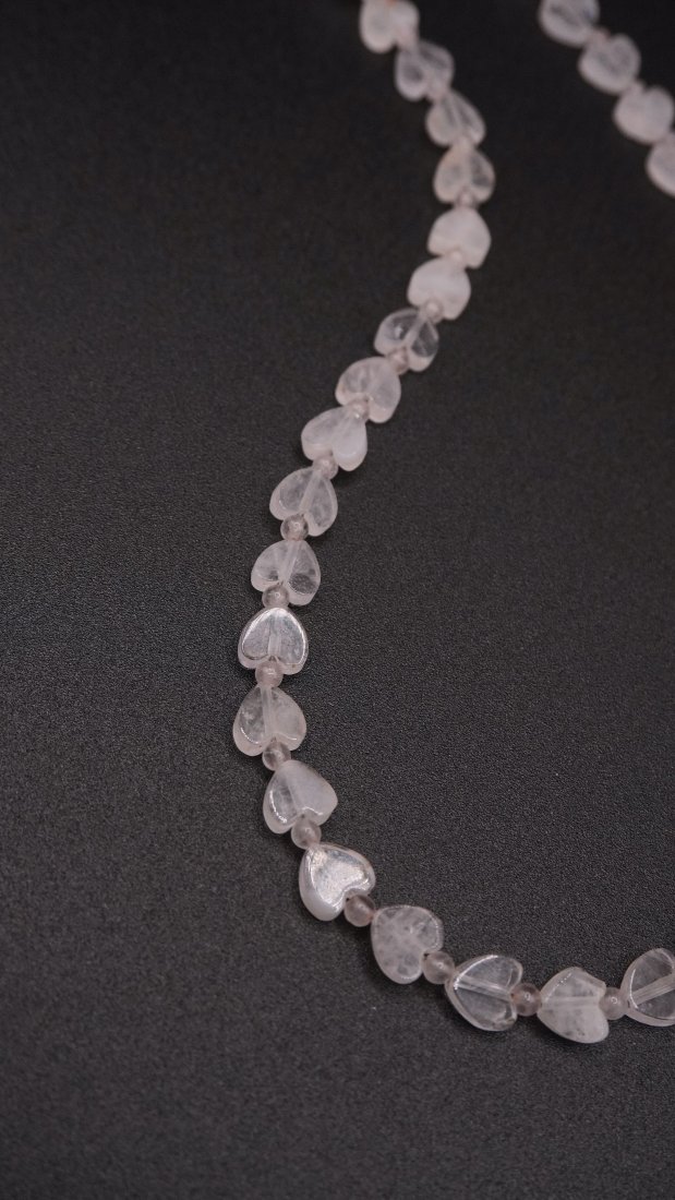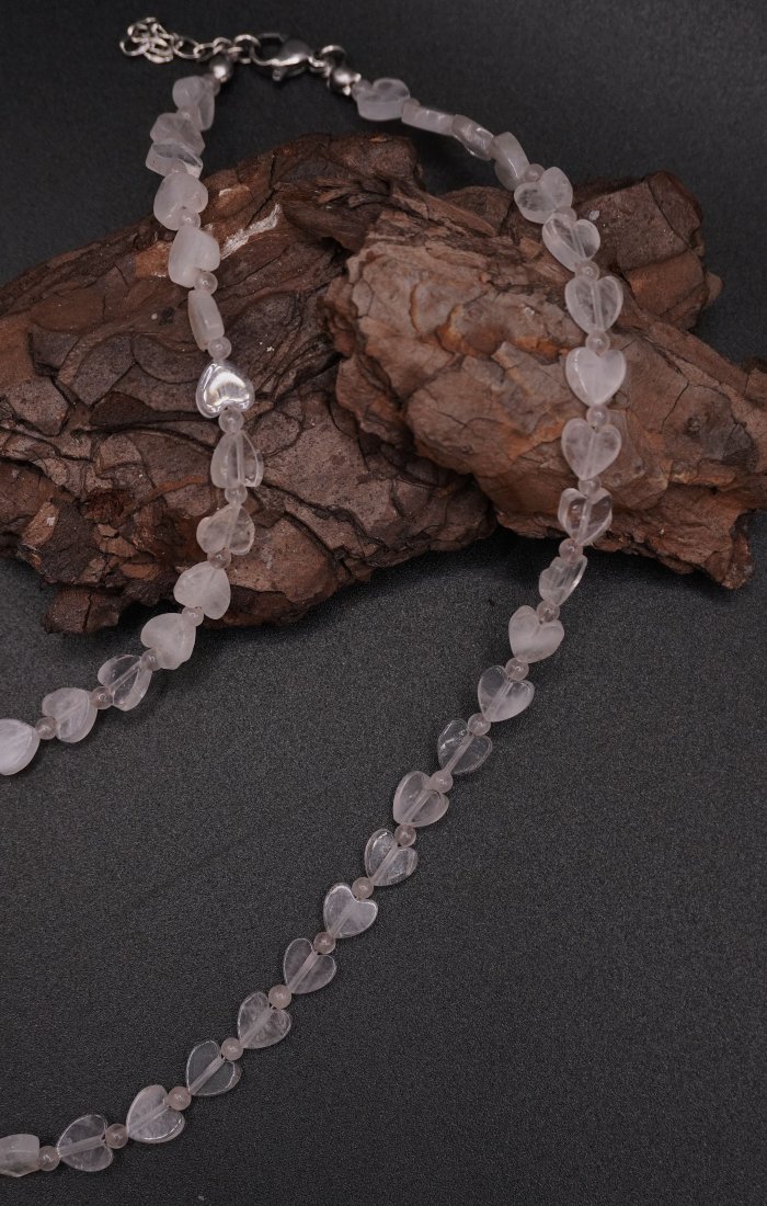 Subtelny i pełen wdzięku naszyjnik wykonany z wyselekcjonowanych bryłek naturalnego kwarcu różowego. Każdy kamień został oszlifowany w kształt delikatnego serca, co nadaje biżuterii romantyczny, a zarazem nowoczesny charakter.