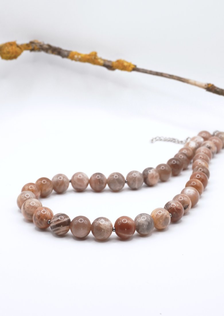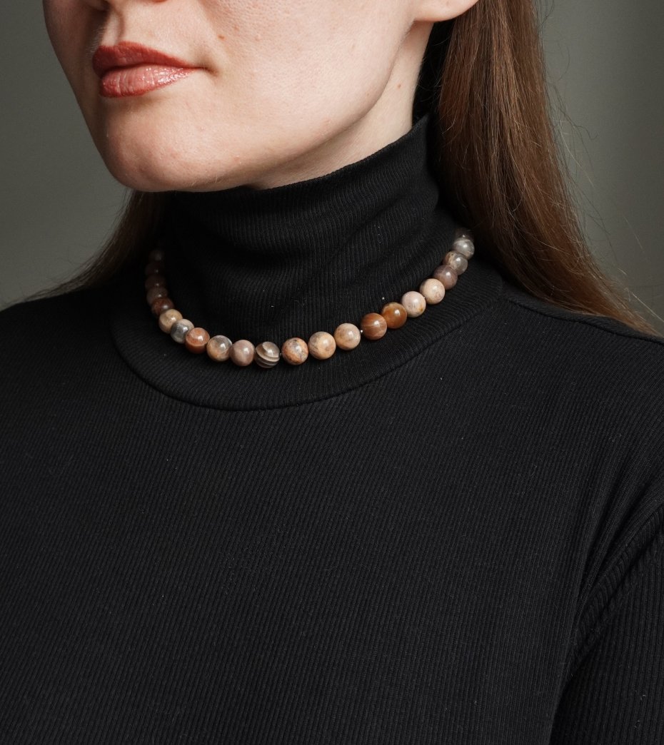 Ciepły, żywy i wypełniony wewnętrznym światłem. Ten naszyjnik jakby gromadzi w sobie energię ziemi i słońca, przekazując poczucie spokojnej siły i naturalnej harmonii. Kamień słoneczny ze swoimi subtelnymi refleksami i naturalną paletą barw buduje wrażenie ciepła, przytulności i pewności siebie.