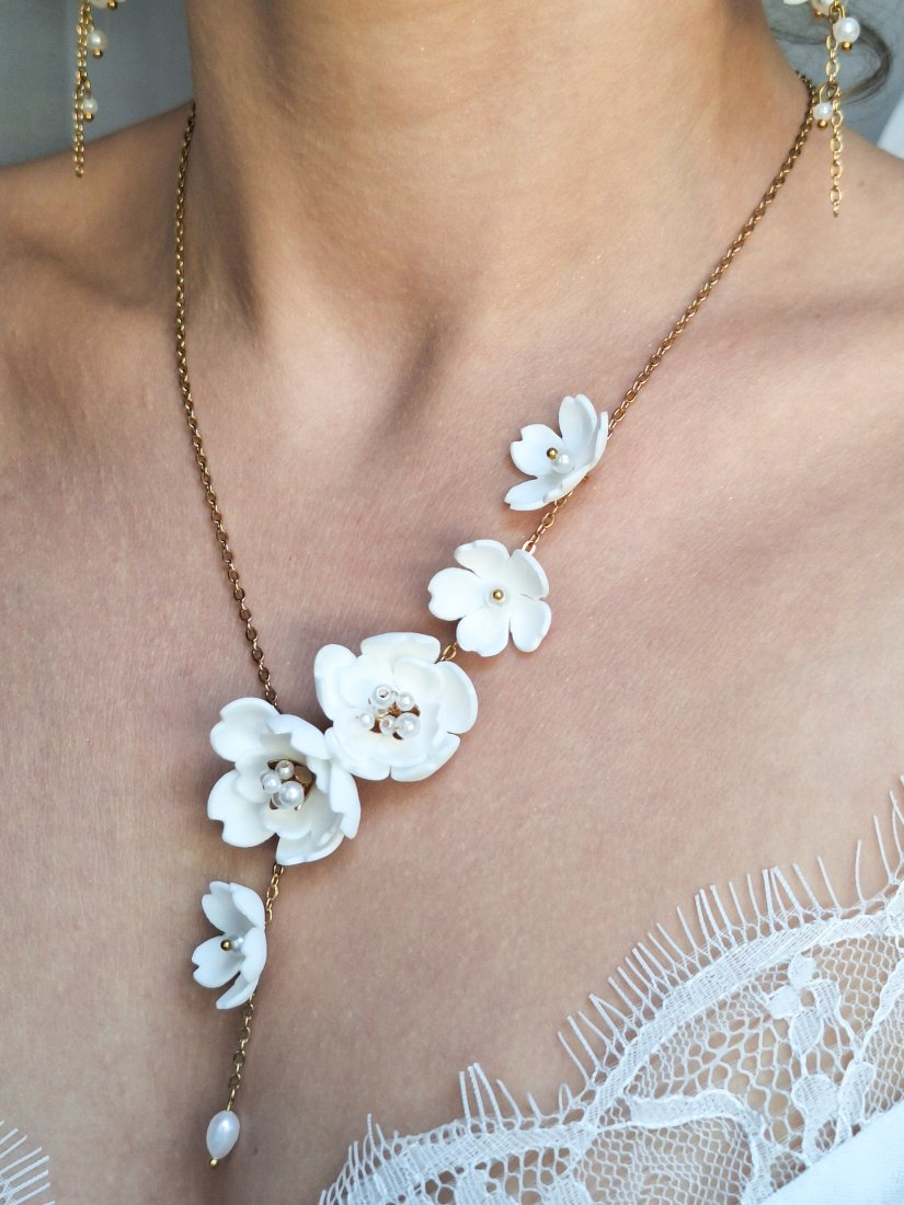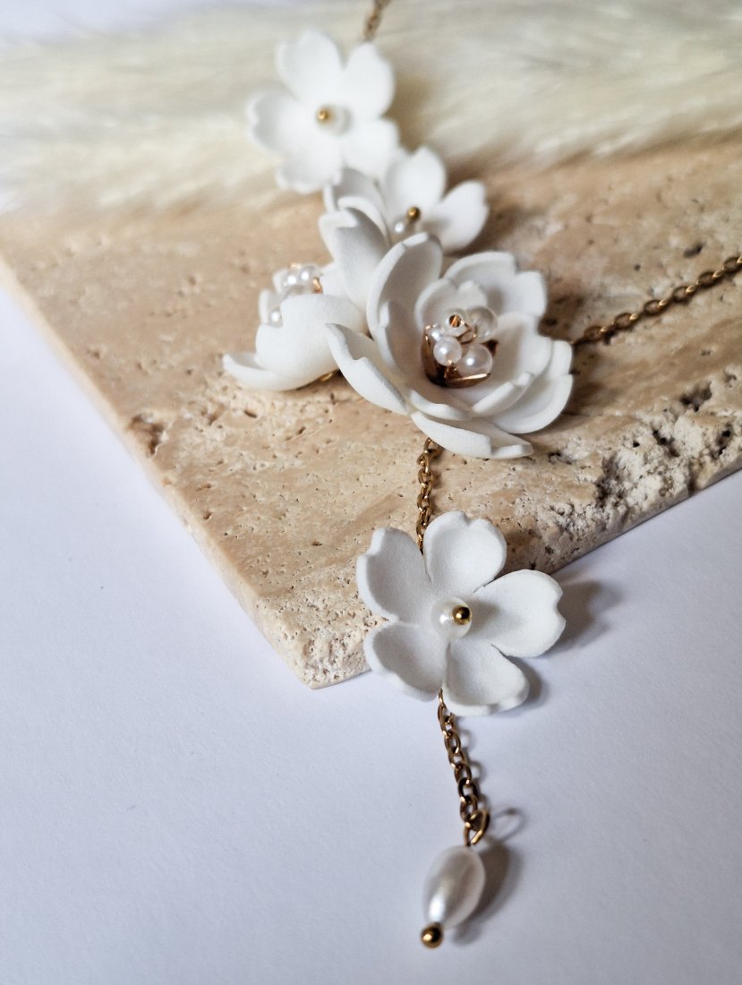 Tagi: #białe kwiaty, #biżuteria ślubna boho, #naszyjnik ślubny, #wisiorek na łańcuszku