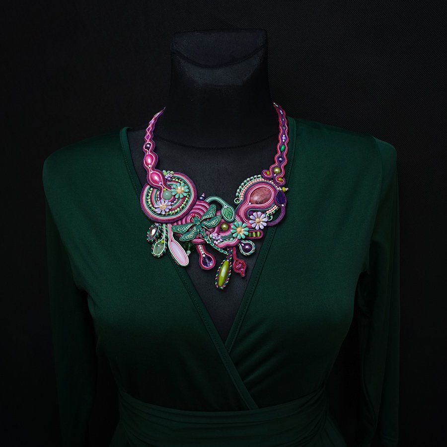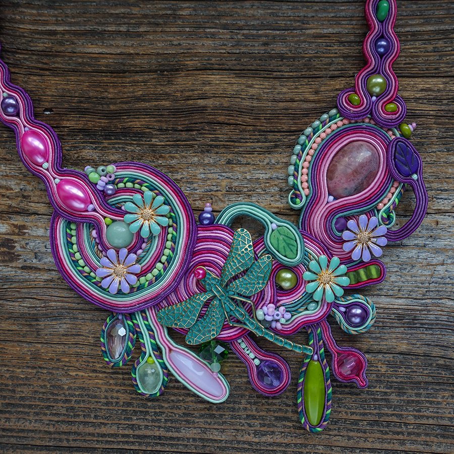 Ręcznie wykonany naszyjnik techniką haftu soutache. To biżuteria inspirowana ogrodem – pełna kolorów, kwiatowych form i subtelnego motywu ważki.