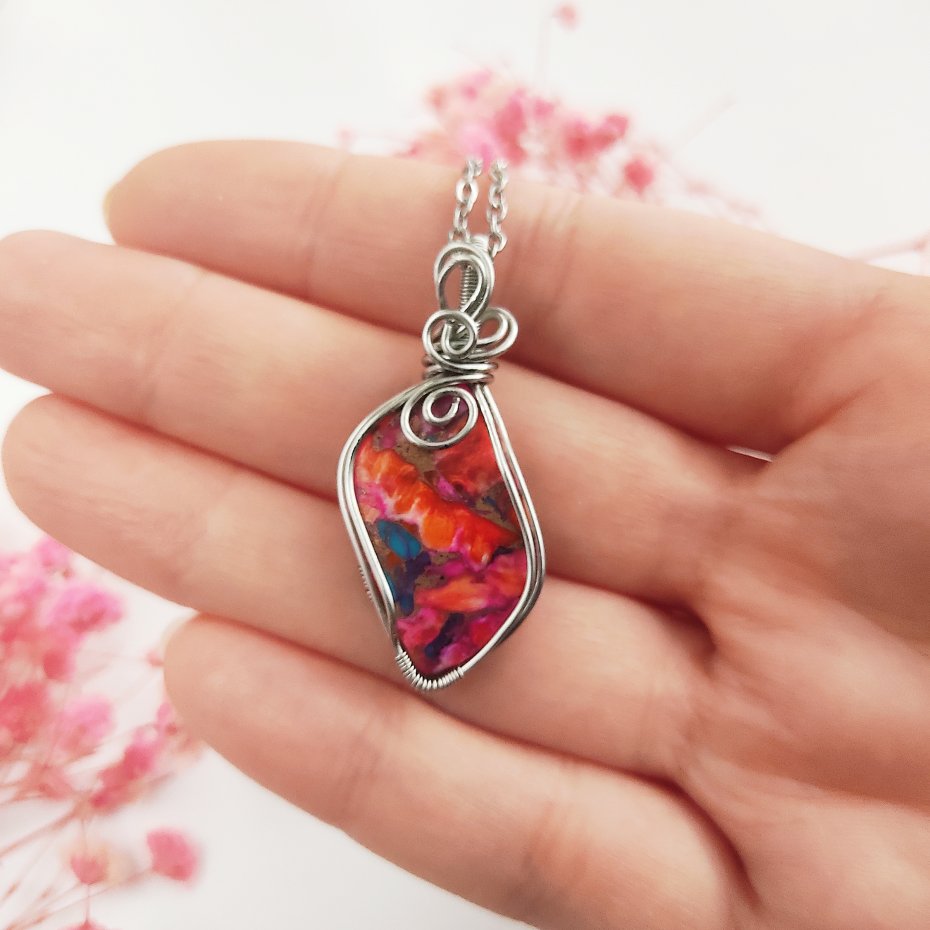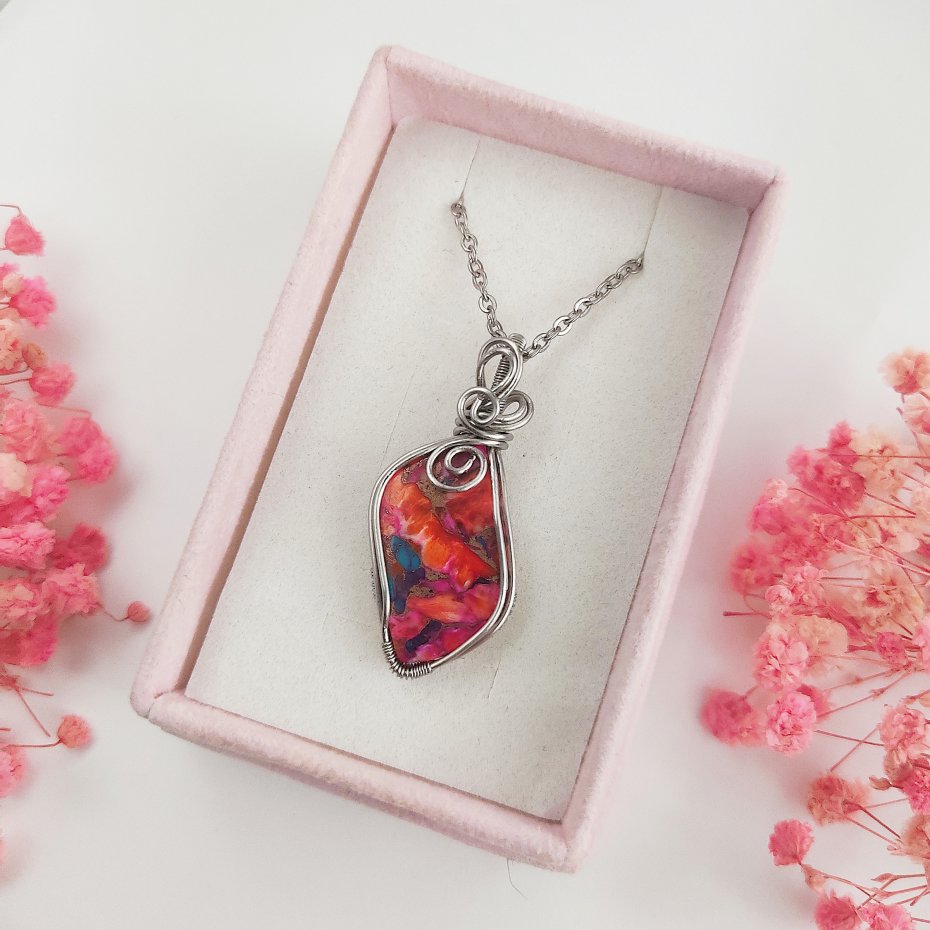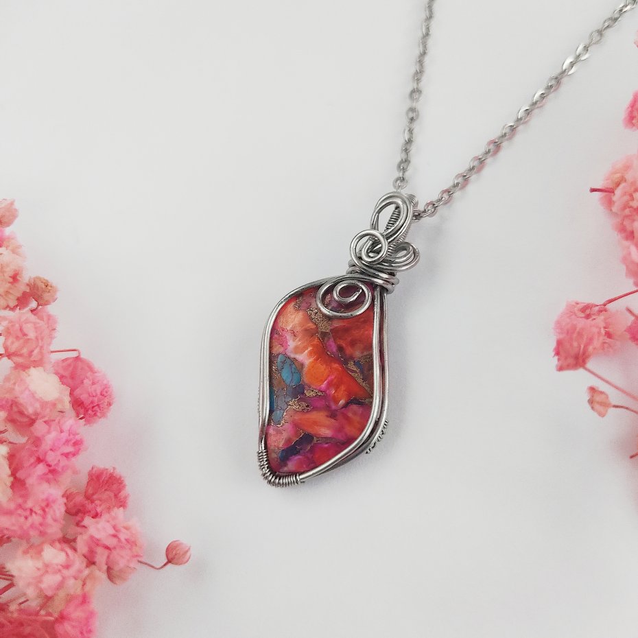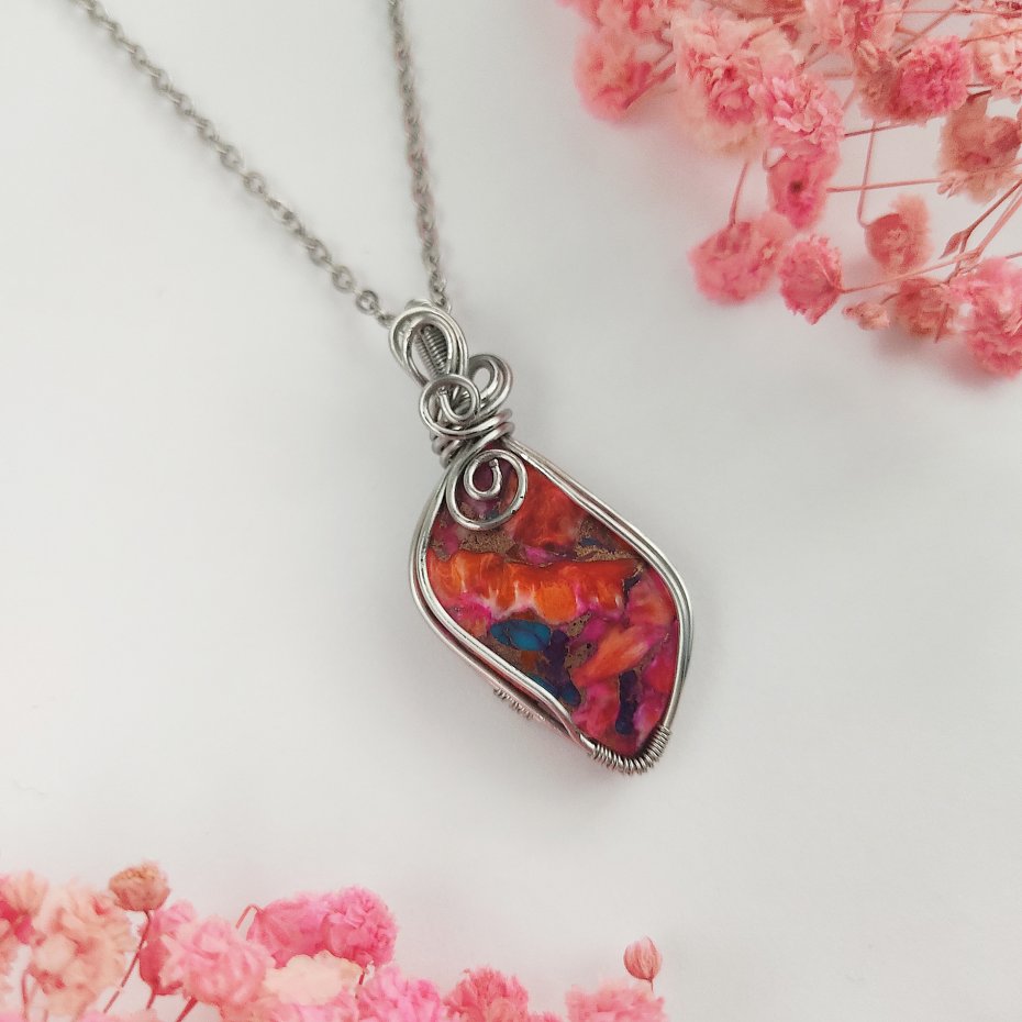 Naszyjnik Spiny Oyster ręcznie robiony. Wykonany techniką wire wrapping z drutów ze stali chirurgicznej.