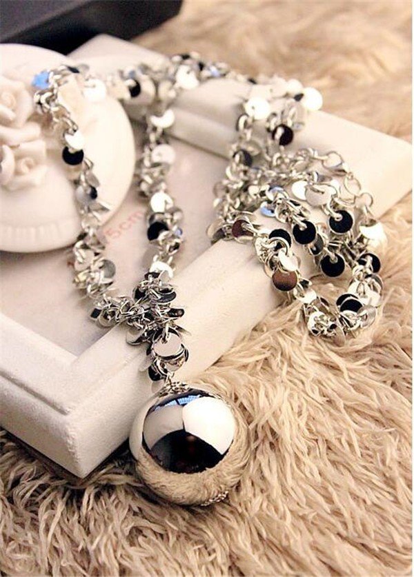 Niezwykle efektowny długi naszyjnik w kolorze srebra.