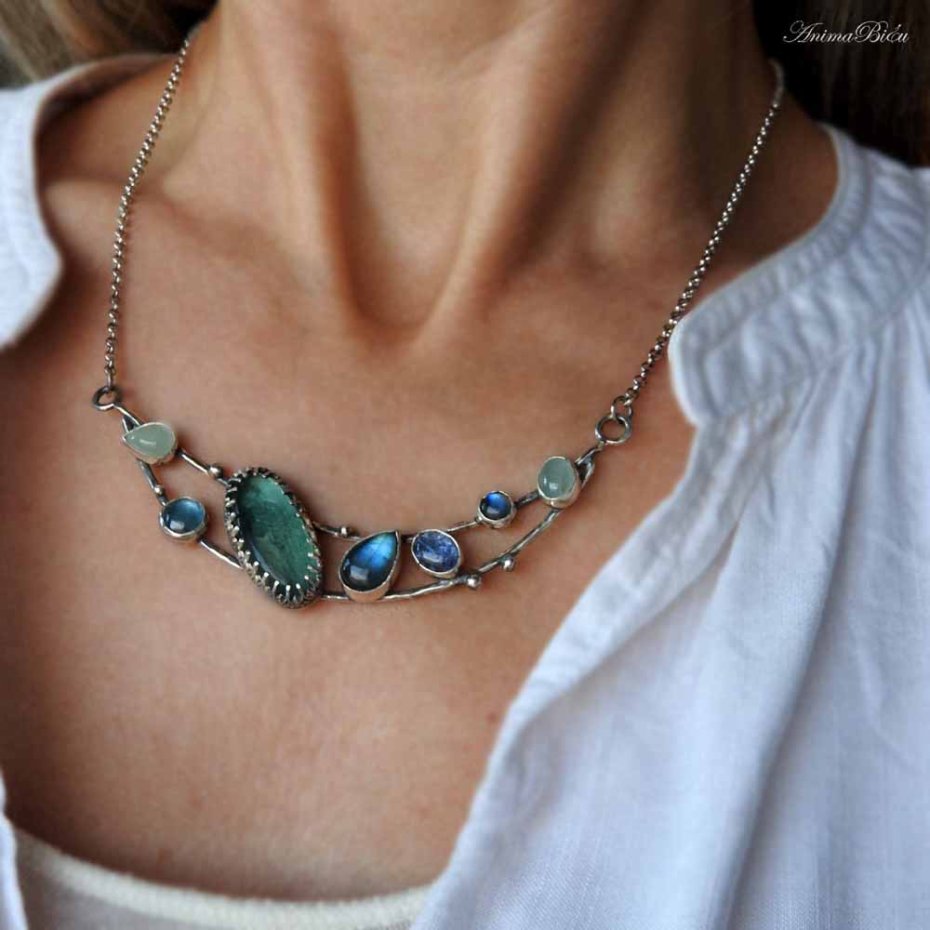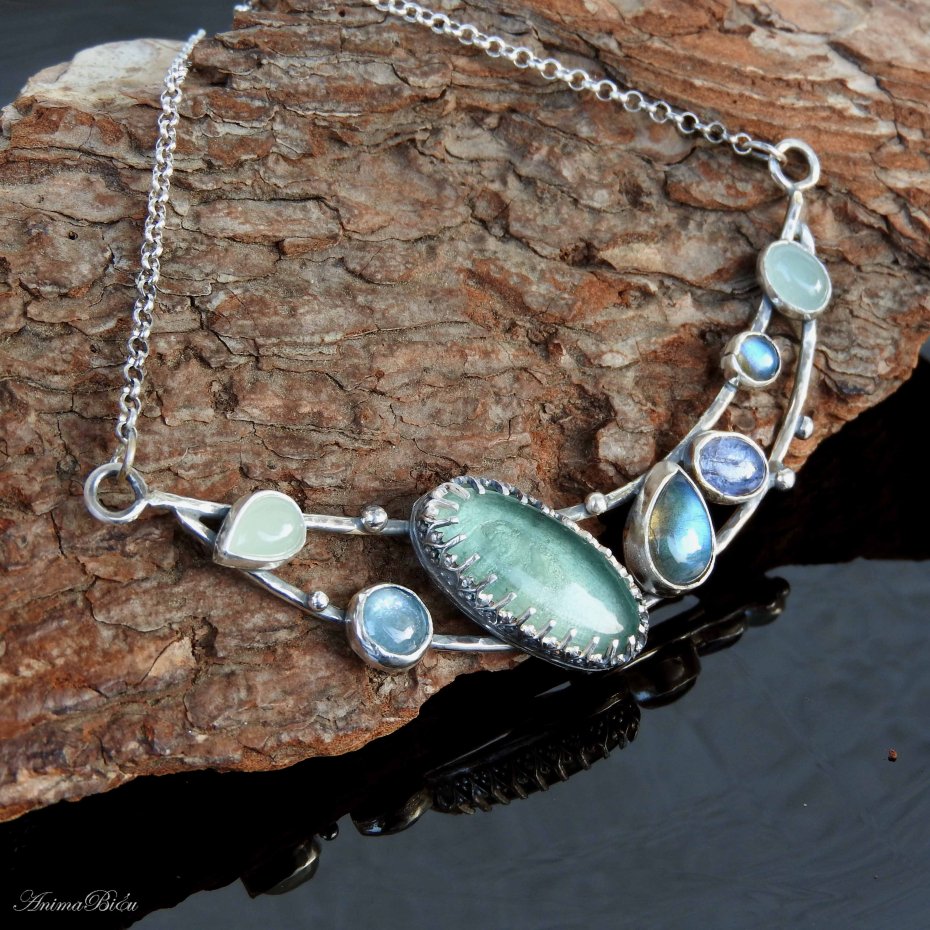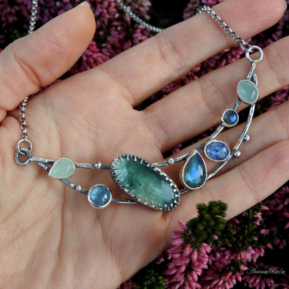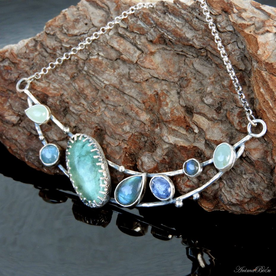 Naszyjnik srebrny z błękitnymi minerałami. Wykonany od podstaw ręcznie naszyjnik powstał ze srebra próby 925 i 999, które przyciemniłam i wypolerowałam. W naszyjniku umieściłam siedem pięknych minerałów w różnych odcieniach niebieskiego. Od lewej jest tam łezka akwamarynu, okrągły kyanit, duży owal fluorytu w srebrnej koronce, potem łezka labradorytu, owal szlachetnego tanzanitu (lekko fioletowy), mały okrągły labradoryt i na końcu owalny akwamaryn. Element z kamieniami wynosi 9 cm. Zawiesiłam go na łańcuszku typu rolo. Obwód naszyjnika wynosi 45 cm z 5 cm łańcuszka przedłużającego (maksymalny obwód 50 cm). Waga naszyjnika to 18,7, w tym srebro 13,4 g. Technika wykonania: lutowanie, młotkowanie. Cechowany w Urzędzie Probierczym.