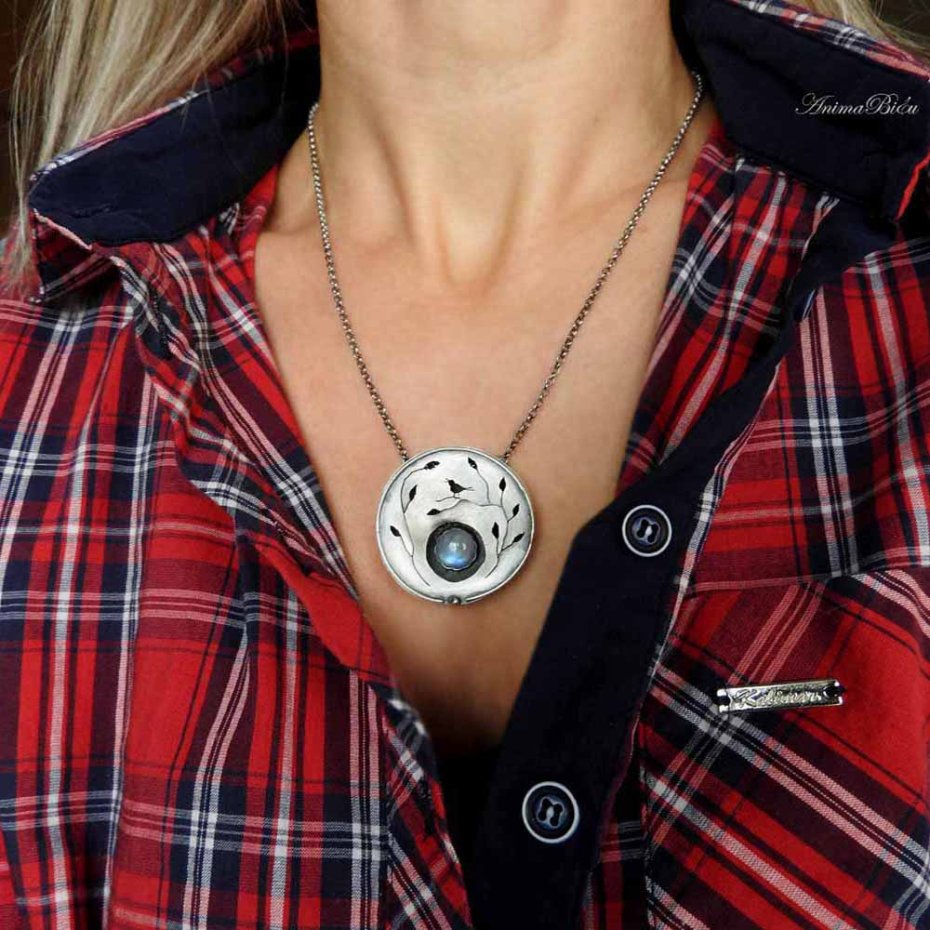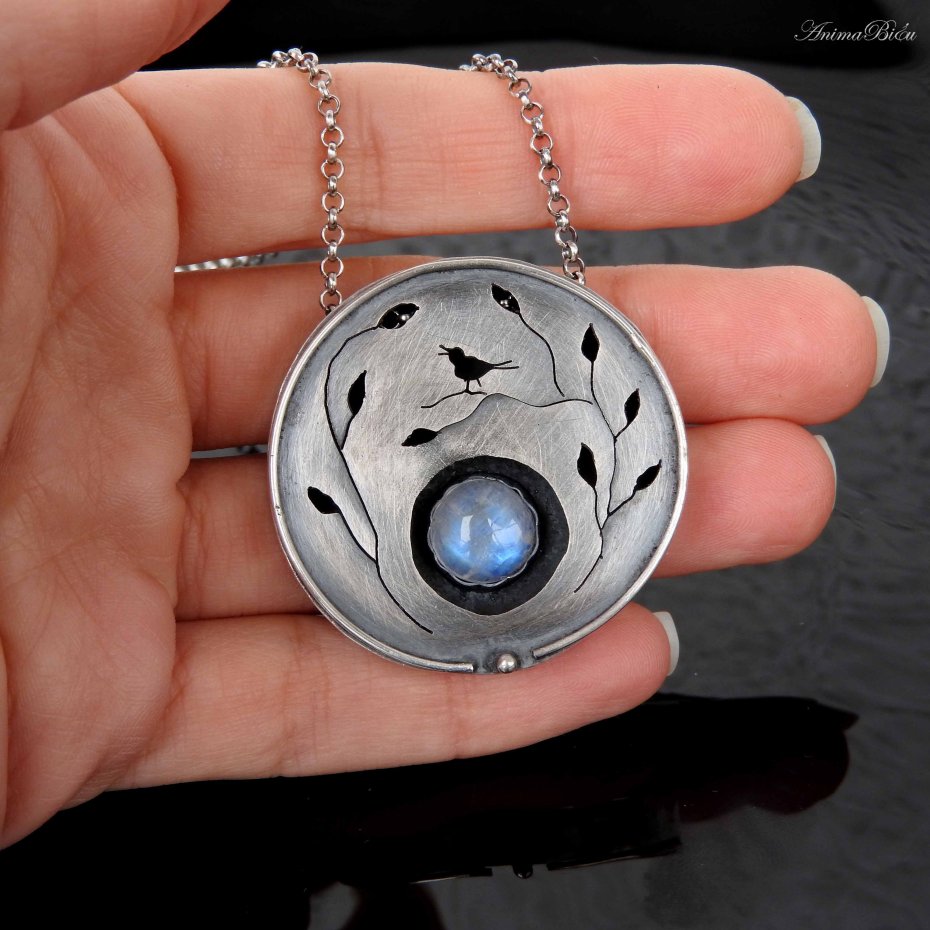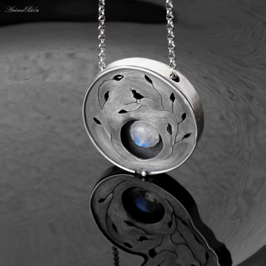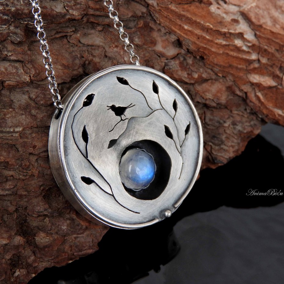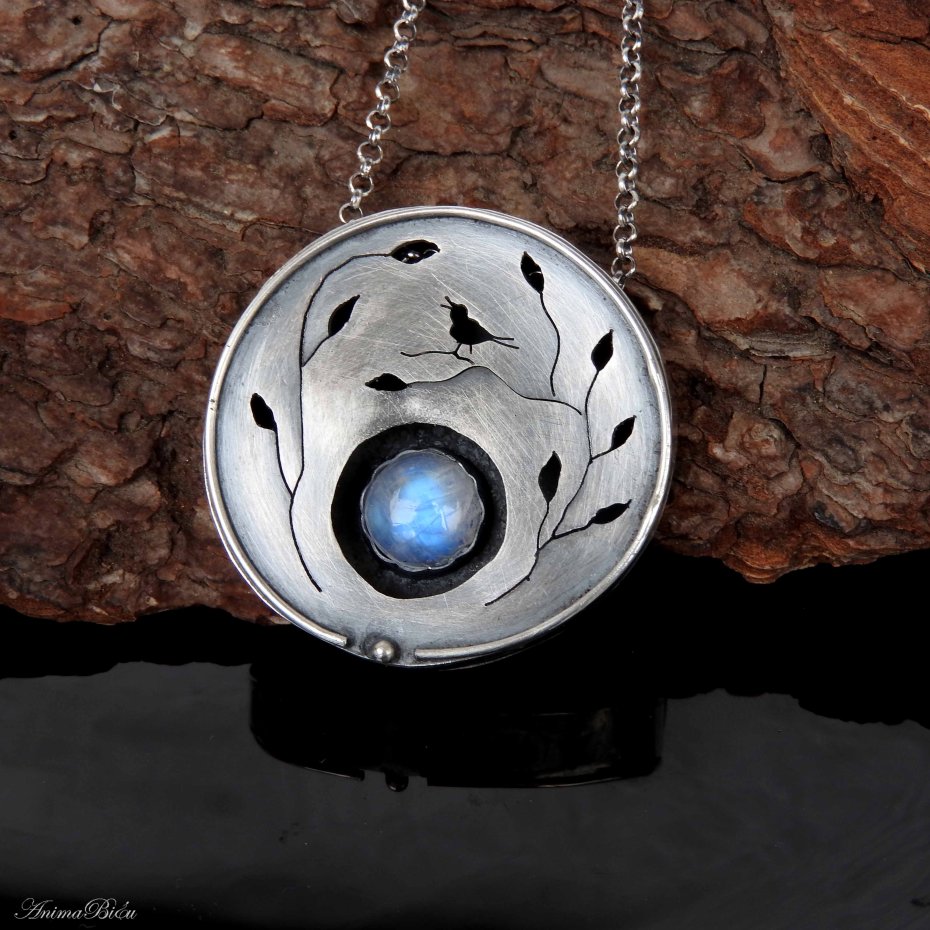 Naszyjnik srebrny z kamieniem księżycowym. Wykonany od podstaw ręcznie medalion powstał ze srebra próby 925 i 999. Sercem wisiorka jest tajemniczo ukryty kamień księżycowy o pięknej, błękitnej poświacie, jednak nie tylko on zwraca uwagę w tej ozdobie. Wokół ukrytego minerału wykonałam liczne roślinne zdobienia, listki, gałązki, a na jednej z nich małego, śpiewającego ptaszka. Całość przyciemniłam, przetarłam na mat, a brzegi wypolerowałam na połysk. Do wisiorka dołączam pasujący do niego łańcuszek typu rolo długości 53 cm. Średnica medalionu wynosi 4 cm, jego grubość to 7 milimetrów. Waga wisiorka: 15,5g w tym srebro 15,2g, łańcuszek: 4,7 g. Technika wykonania: lutowanie, młotkowanie. Cechowany w Urzędzie Probierczym.