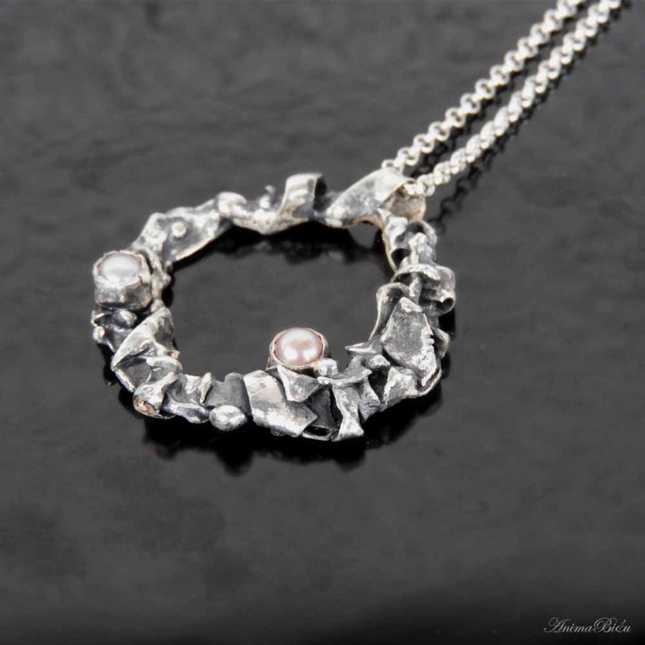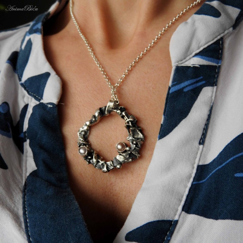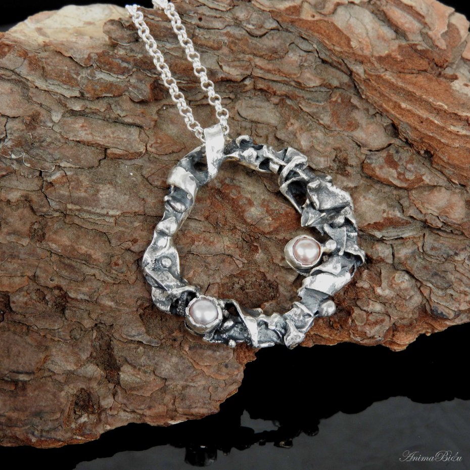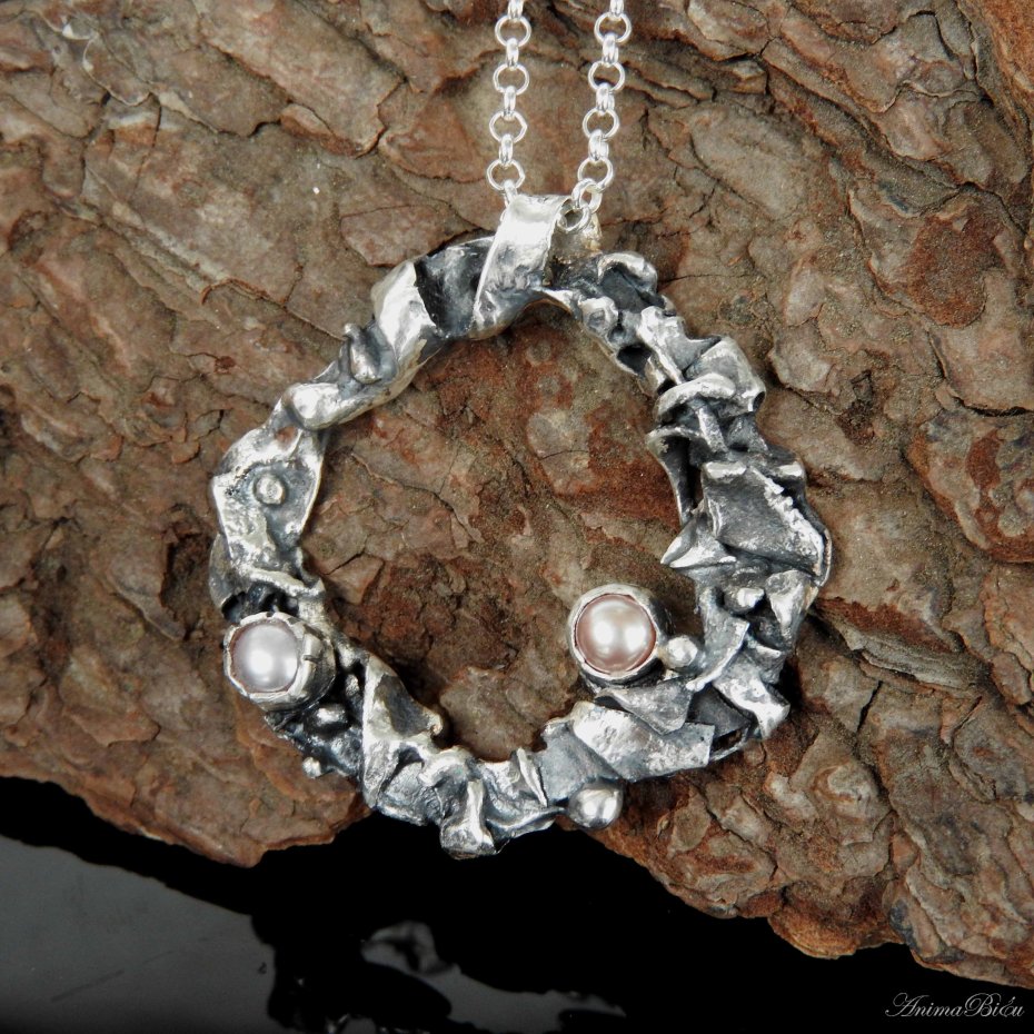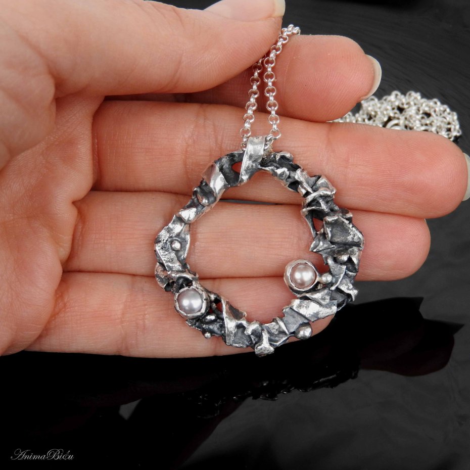 Naszyjnik srebrny z perłami słodkowodnymi. Wisiorek wykonałam od podstaw ręcznie z przetapianego srebra próby 925, które mocno przyciemniłam i przetarłam. Ozdoba ta ma bardzo surowy, organiczny charakter. Nieregularne, srebrne kółko zdobią dwie perły słodkowodne, jedna w śmietankowym, druga w lekko beżowym odcieniu. Średnica wisiorka wynosi ok.4 cm. Wisiorek zawiesiłam na łańcuszku typu rolo o długości 48 cm plus łańcuszek regulacyjny, który daje maksymalny obwód naszyjnika 55 cm. Waga 13,9g. Technika wykonania: lutowanie, młotkowanie. Cechowany w Urzędzie probierczym.