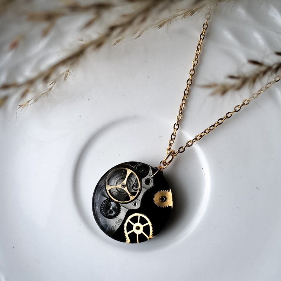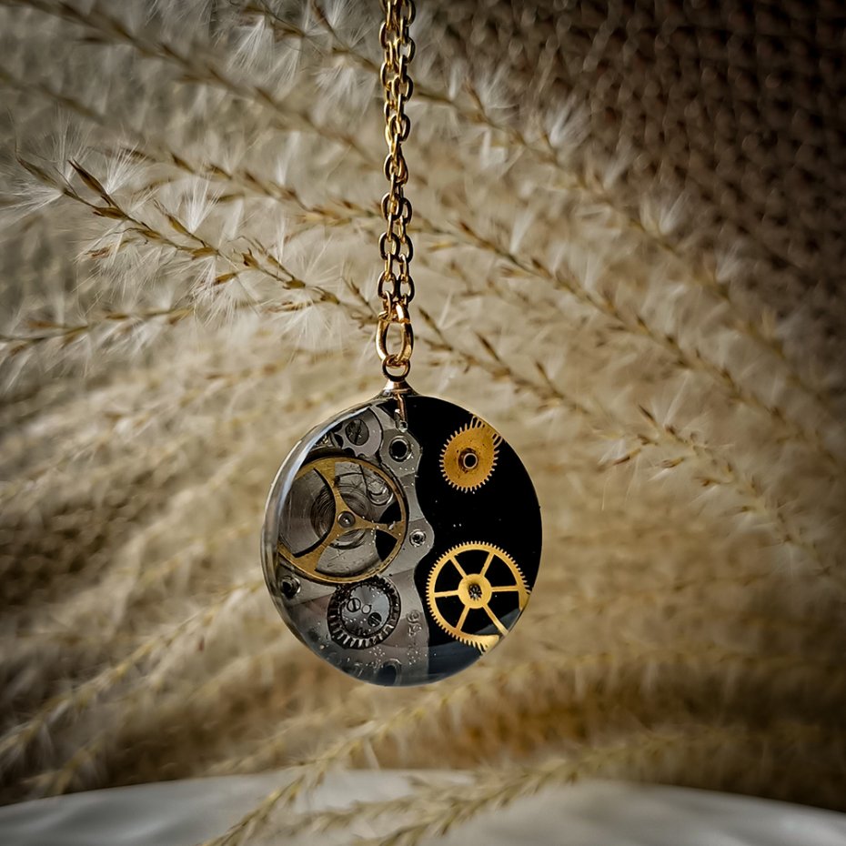Wyjątkowy naszyjnik w stylu steampunk, stworzony z myślą o miłośnikach oryginalnej biżuterii i estetyki retro-futurystycznej. Zawieszka kryje w sobie autentyczne mechanizmy zegarka, starannie zatopione w przezroczystej żywicy, co nadaje całości niepowtarzalny, industrialny charakter. Każdy egzemplarz jest unikalny i wykonany ręcznie, dzięki czemu naszyjnik wyróżnia się detalem i głębią. Idealny dodatek do stylizacji vintage, alternatywnych i codziennych, a także doskonały pomysł na prezent dla fanów steampunku, mechaniki i sztuki handmade.
