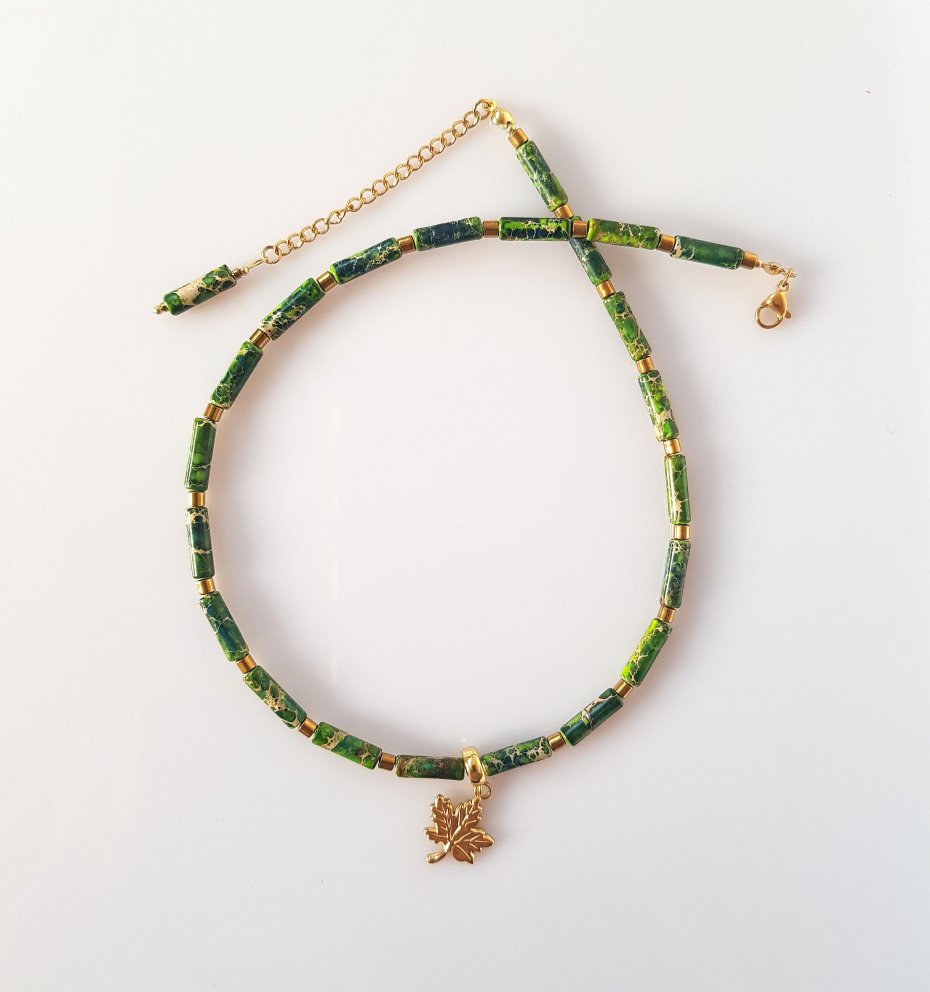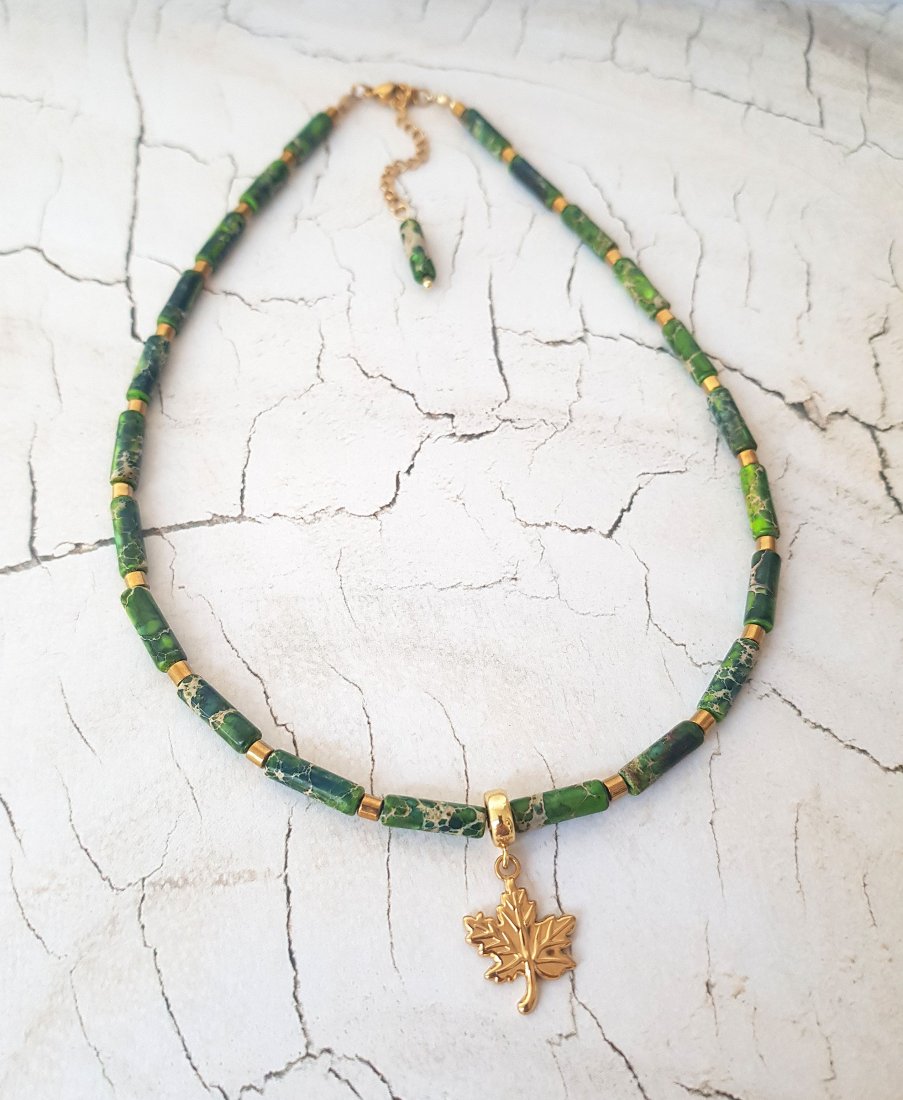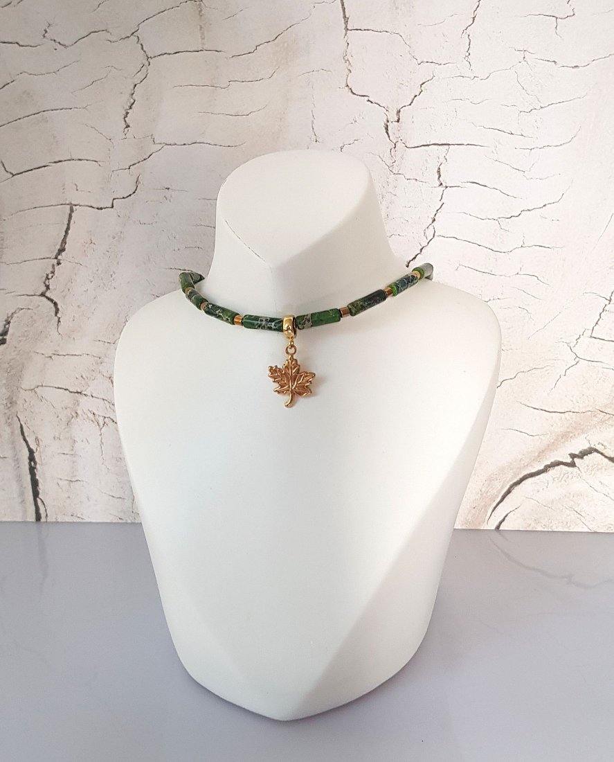Naszyjnik wykonany z patyczków jaspisu w odcieniach zieleni i złotych wałeczków hematytu.