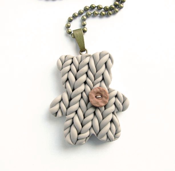 Uroczy naszyjnik w kształcie szarego sweterkowego misia z guziczkiem wykonany ręcznie z masy fimo. Wielkość misia: 4 cm, długość łańcuszka: 65 cm
