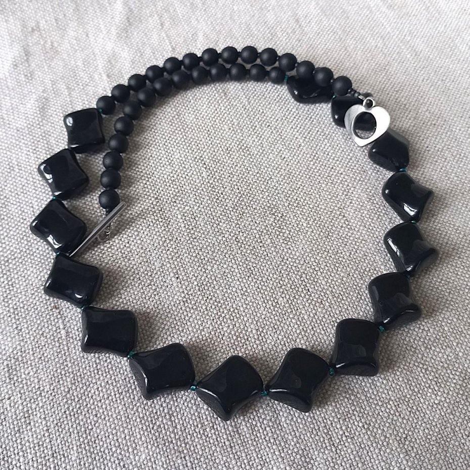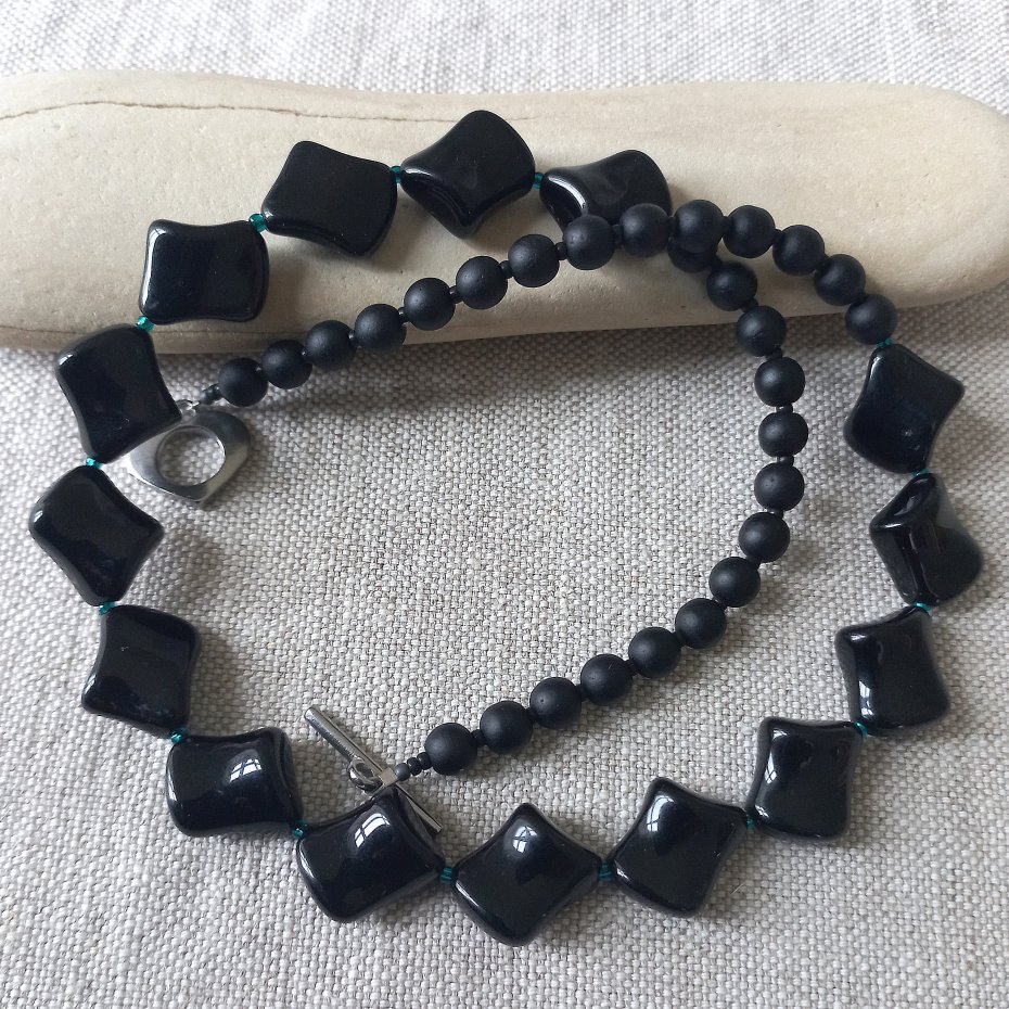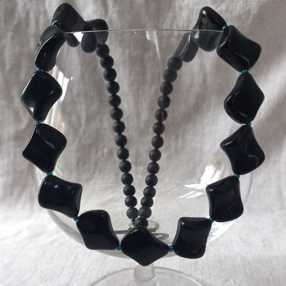 Naszyjnik z ciekawych szklanych świderków, przełożonych niewielkimi kryształkami w kolorze intensywnie turkusowym. Elementy ze szkła (wym. ok. 1,5 x 1,5 cm każdy) pięknie błyszczą na tle matowego wykończenia black stone.