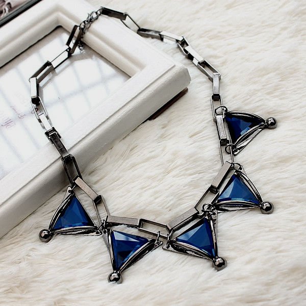 Wykonany z szafirowego fasetowanego szkła, na grubym metalowym łańcuchu w kolorze hematytu.