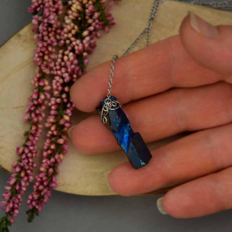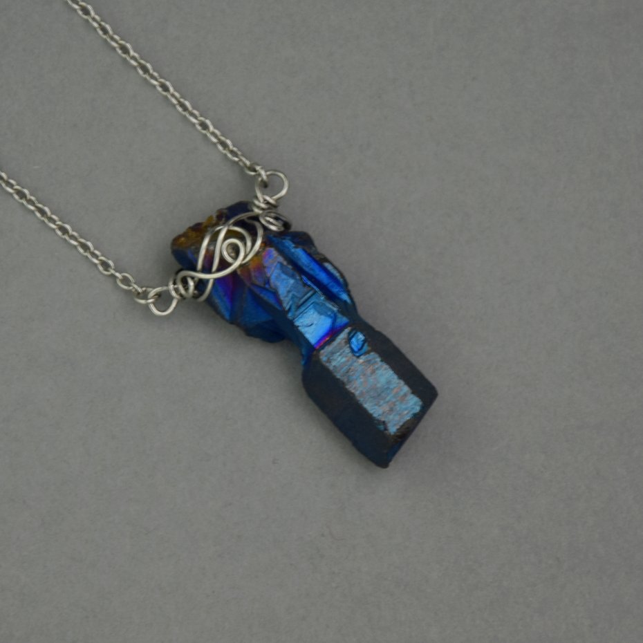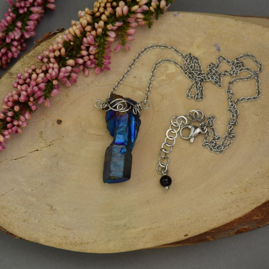 Ręcznie zrobiony naszyjnik z kolekcji Talizmany z kryształem górskim pokrytym warstwą tytanu. Zrobiony techniką wire wrapping z drutów ze stali chirurgicznej.