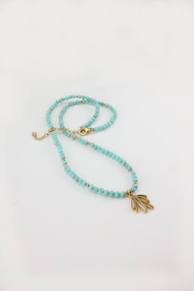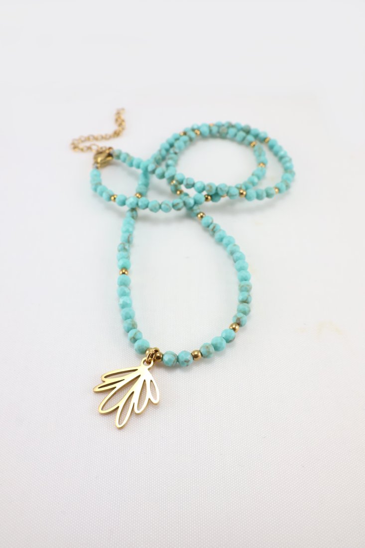 Ten naszyjnik to esencja błękitnego nieba i głębokiego morza, zamknięta w misternych, fasetowanych koralikach. Magnezyt, znany jako kamień ciszy i relaksu, działa jak Twój osobisty, noszony przy sobie, amulet spokoju. Subtelny, złoty liść wykonany ze stali chirurgicznej, pięknie prezentuje się przy dekolcie, symbolizując odradzanie się i piękno prostej natury.