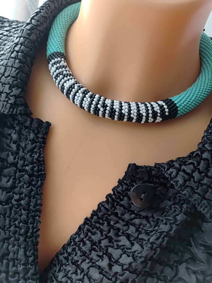 Dodaj koloru i wyrazistości swojej stylizacji dzięki unikatowemu naszyjnikowi wykonanemu techniką sznura szydełkowo-koralikowego. To idealne połączenie nowoczesnego designu z precyzyjnym rękodziełem. Centralnym punktem naszyjnika jest kontrastowy, czarno-biały motyw pasów przypominający zebrę, który płynnie przechodzi w soczysty, turkusowy błękit. Całość została wykończona eleganckimi elementami w kolorze srebra – ozdobne końcówki w kształcie tulipanów dodają mu romantycznego, a zarazem luksusowego charakteru. Wykonany z tysięcy drobnych koralików szklanych, co zapewnia piękny połysk i trwałość. Naszyjnik jest lekki, elastyczny i przyjemny dla skóry. Wyposażony w solidne zapięcie typu karabińczyk z łańcuszkiem przedłużającym, co pozwala na idealne dopasowanie długości. Doskonale sprawdzi się zarówno do białej koszuli, jak i letniej sukienki czy casualowego t-shirtu.