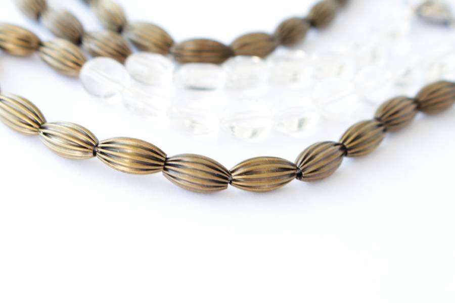 Oryginalny naszyjnik vintage złożony z różnorodnych elementów - w kolorze starego złota i transparentnych.