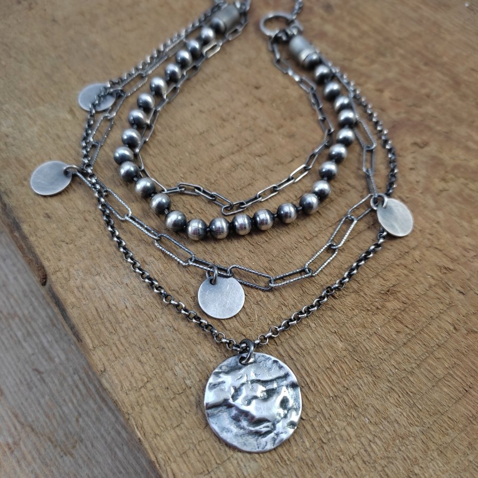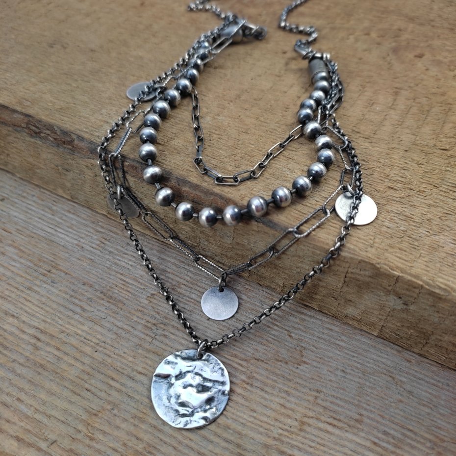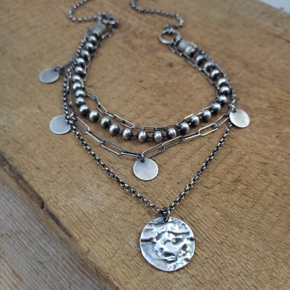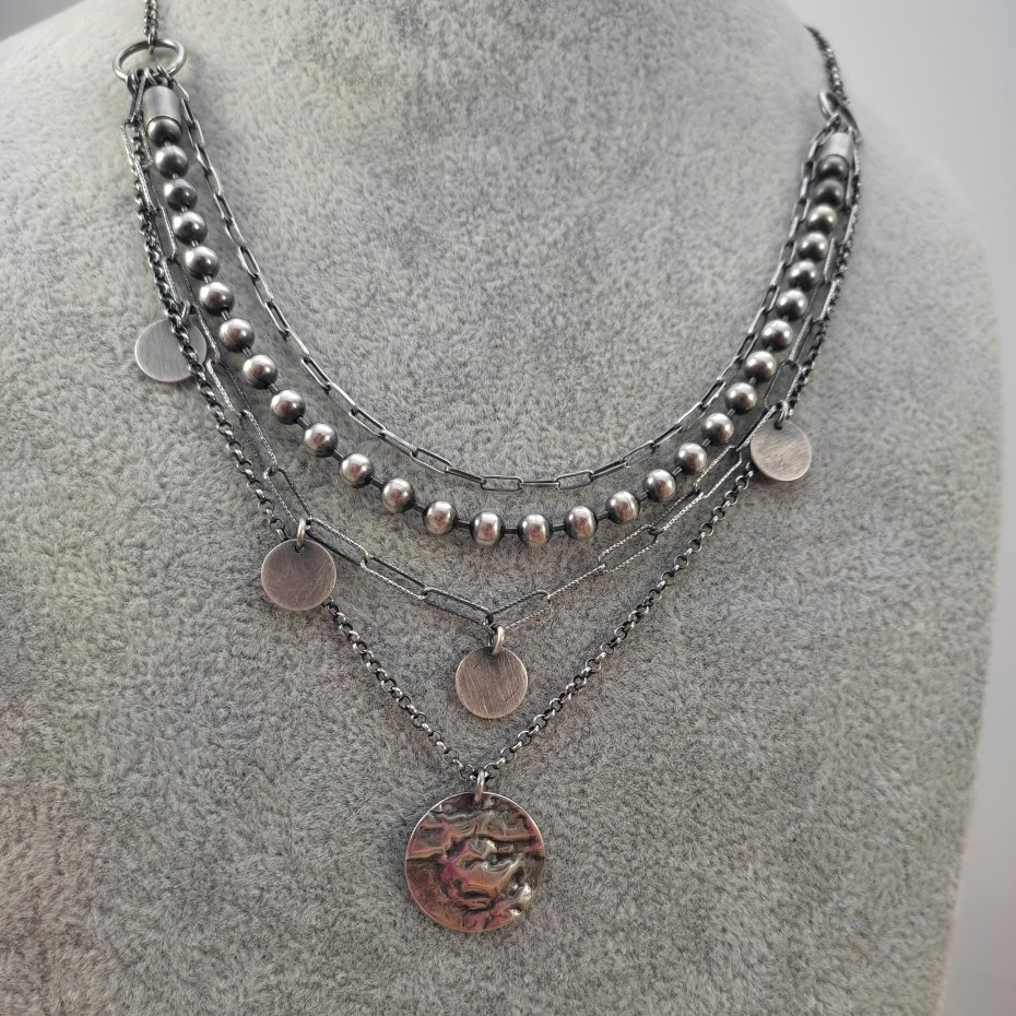 Naszyjnik wykonany ze srebra 925, oksydowanego i wypolerowanego (w tym kółka- blaszki 10-19 mm). Długość naszyjnika wynosi ok. 40/45/50 cm, plus łańcuszek regulacyjny 5 cm. (Proszę wpisać w komentarzu, w przypadku braku wysyłamy 45 cm). Elegancko zapakowany.