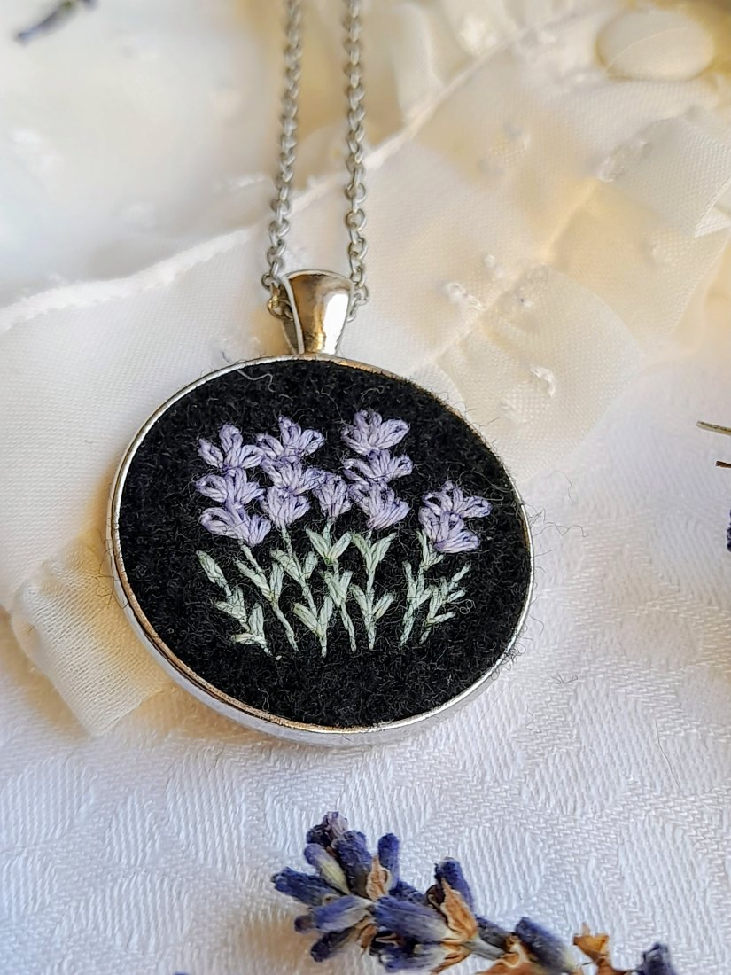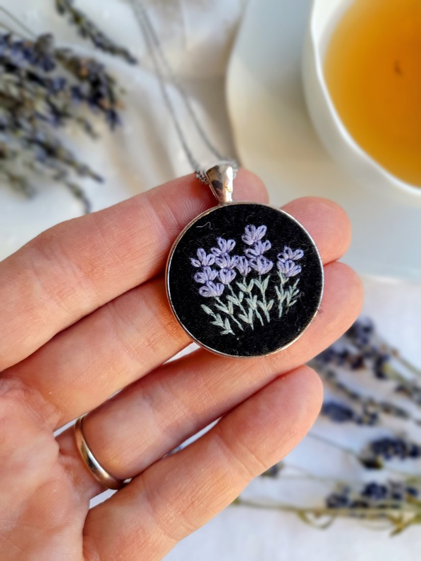 Delikatny, haftowany ręcznie naszyjnik z jasnofioletowymi gałązkami lawendy na czarym tle. To jak powiew chłodnego wieczornego wiatru po upalnym dniu. Ucieszy wielbicielki kwiatowych romantycznych stylizacji.
