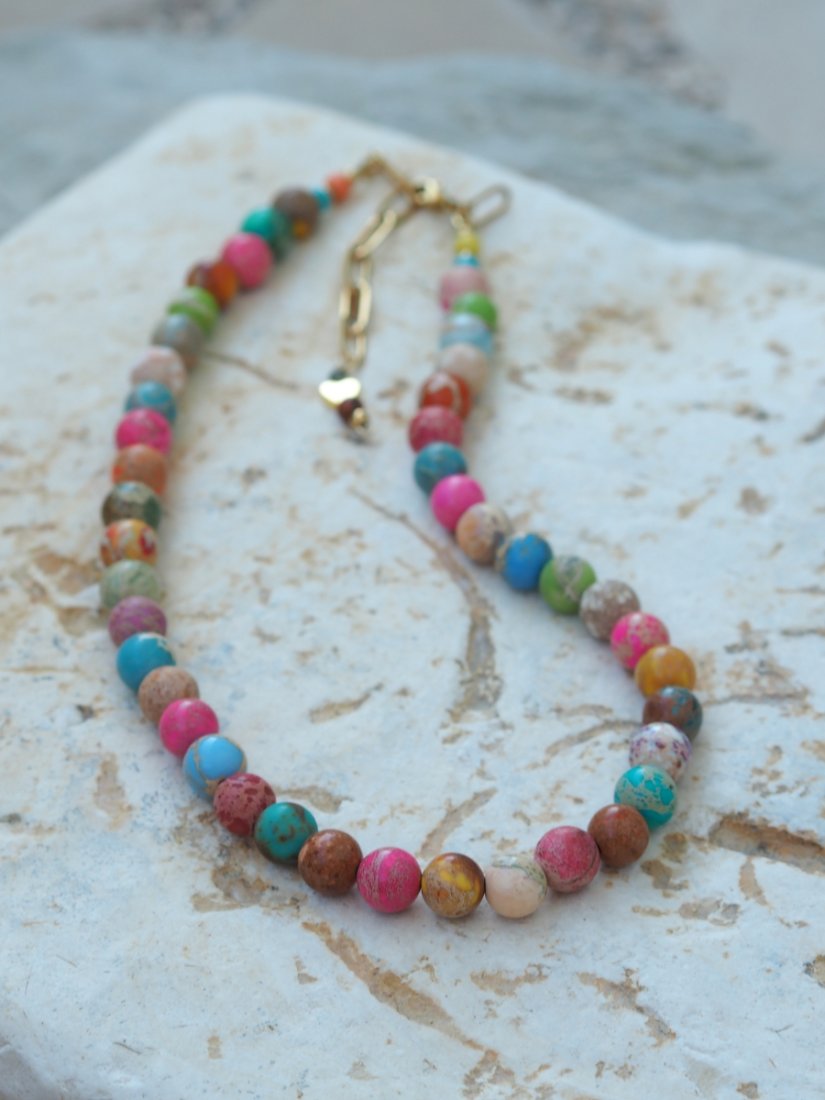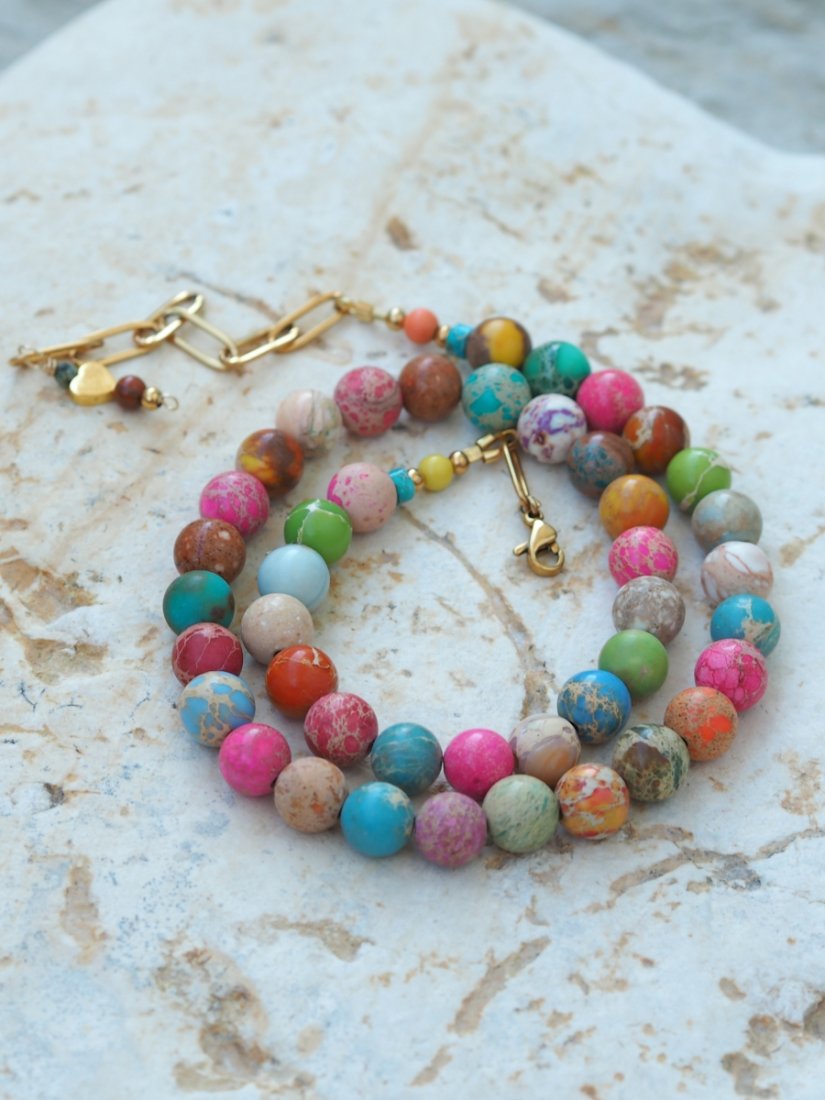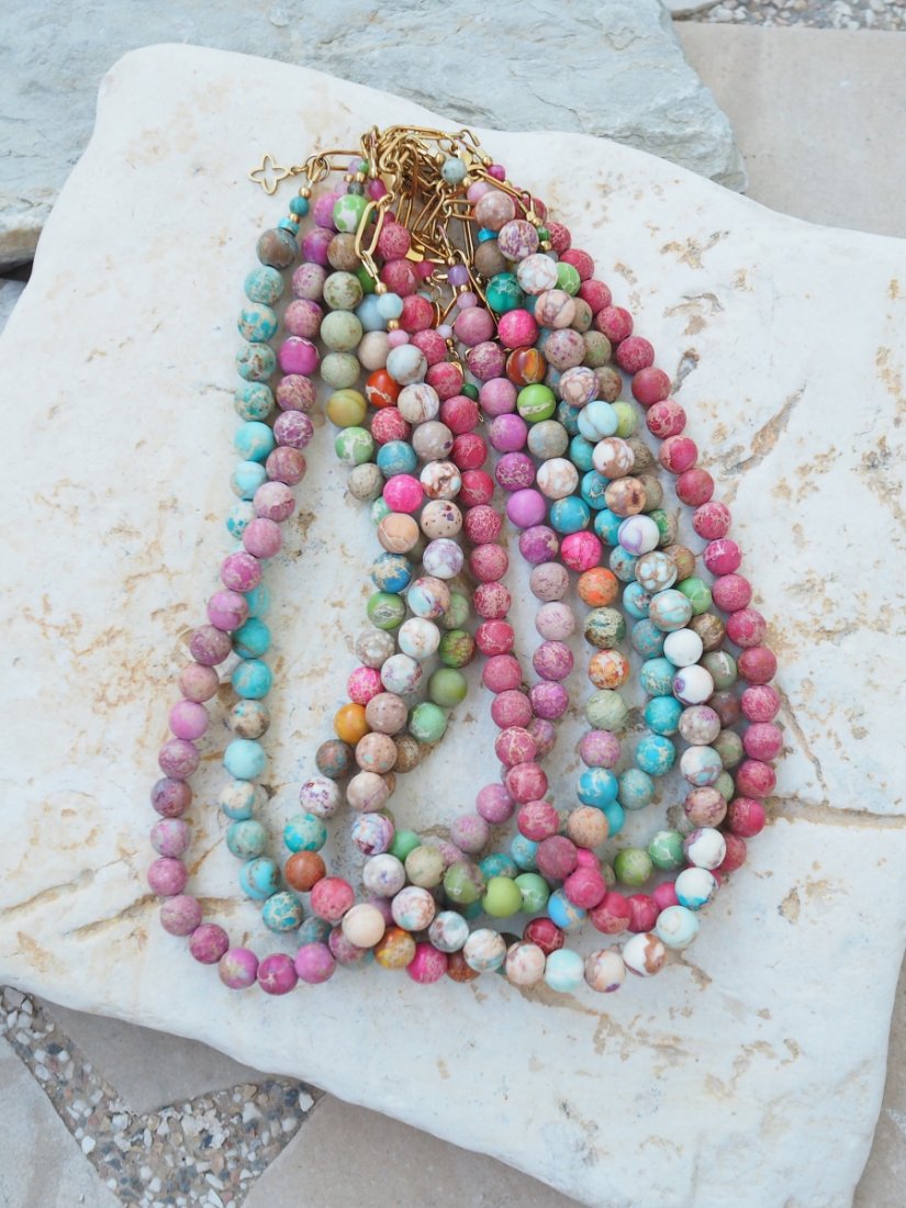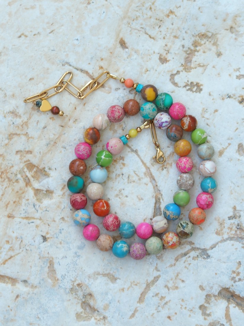 Naszyjnik z kamienia Jaspis Cesarski to podróż przez kolory natury – od mięty i turkusu, po odcienie różu, piasku i brązu. Każdy koralik ma swój własny rysunek, jakby zamknięto w nim fragment pejzażu – dlatego każdy naszyjnik jest absolutnie niepowtarzalny.