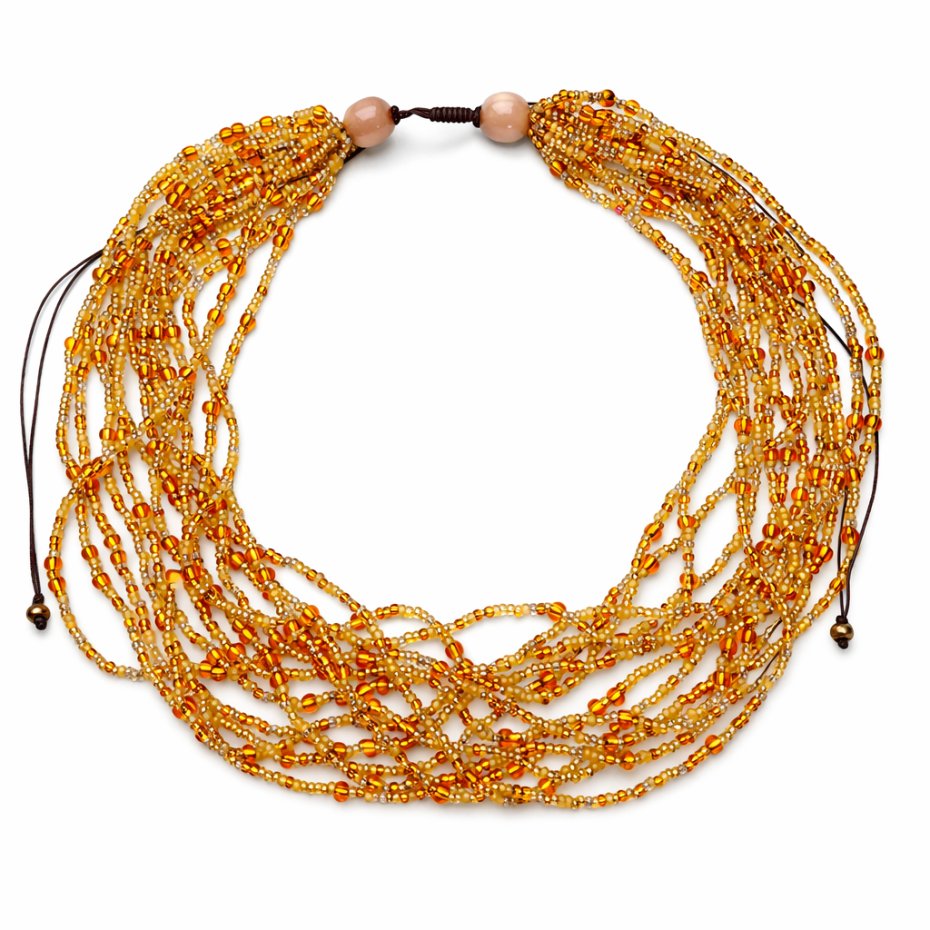 Naszyjnik to wyrazista, wielowarstwowa biżuteria o ciepłym, naturalnym charakterze. Składa się z wielu cienkich sznurów, które gęsto przylegają do siebie, tworząc efekt szerokiej kolii. Elementy drobne koraliki szklane seed beads przypominające naturalny bursztyn. Naszyjnik nawiązuje do stylu etno lub boho. Jest na tyle duży, że może stanowić główny akcent całej stylizacji. Korale układają sie kaskadowo, idealnie wypwłniając przestrzeń przy dekolcie.