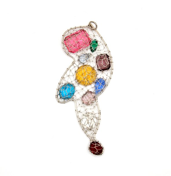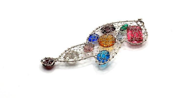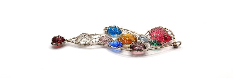 Zawieszka - naszyjnik wykonany z biżuteryjnego drutu w kolorze srebrnym, oplatającego wielobarwne szklane kaboszony szlifowane (używane jako oczka wklejane do biżuterii). Jedyny taki, handmade. Do powieszenia na łańcuszku, sznurku czy rzemyku.